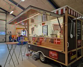 To moderne og flot folierede salgsvogne der er fuldt udstyret til salg af pandekager, burgere, poke bowl, Wraps, sandwich og drikkevarer straks fra ov Læs mere