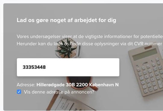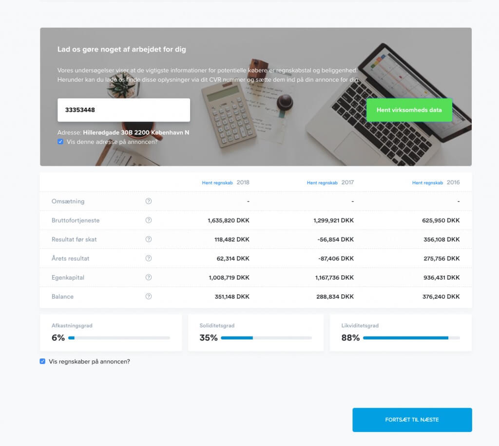 Den første ting vi har tilføjet er, at du ved at indtaste dit CVR nummer på din annonce, automatisk kan trække dine regnskabstal ind på annoncen og vise dem frem med et enkelt klik.