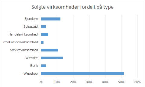 Virksomhederne der sættes til salg, på Saxis er inddelt i 8 forskellige typer. Webshop er den type af virksomhed der sælges klart flest af. Hele 52% af alle solgte virksomheder, det sidste år, har været inden for denne type.