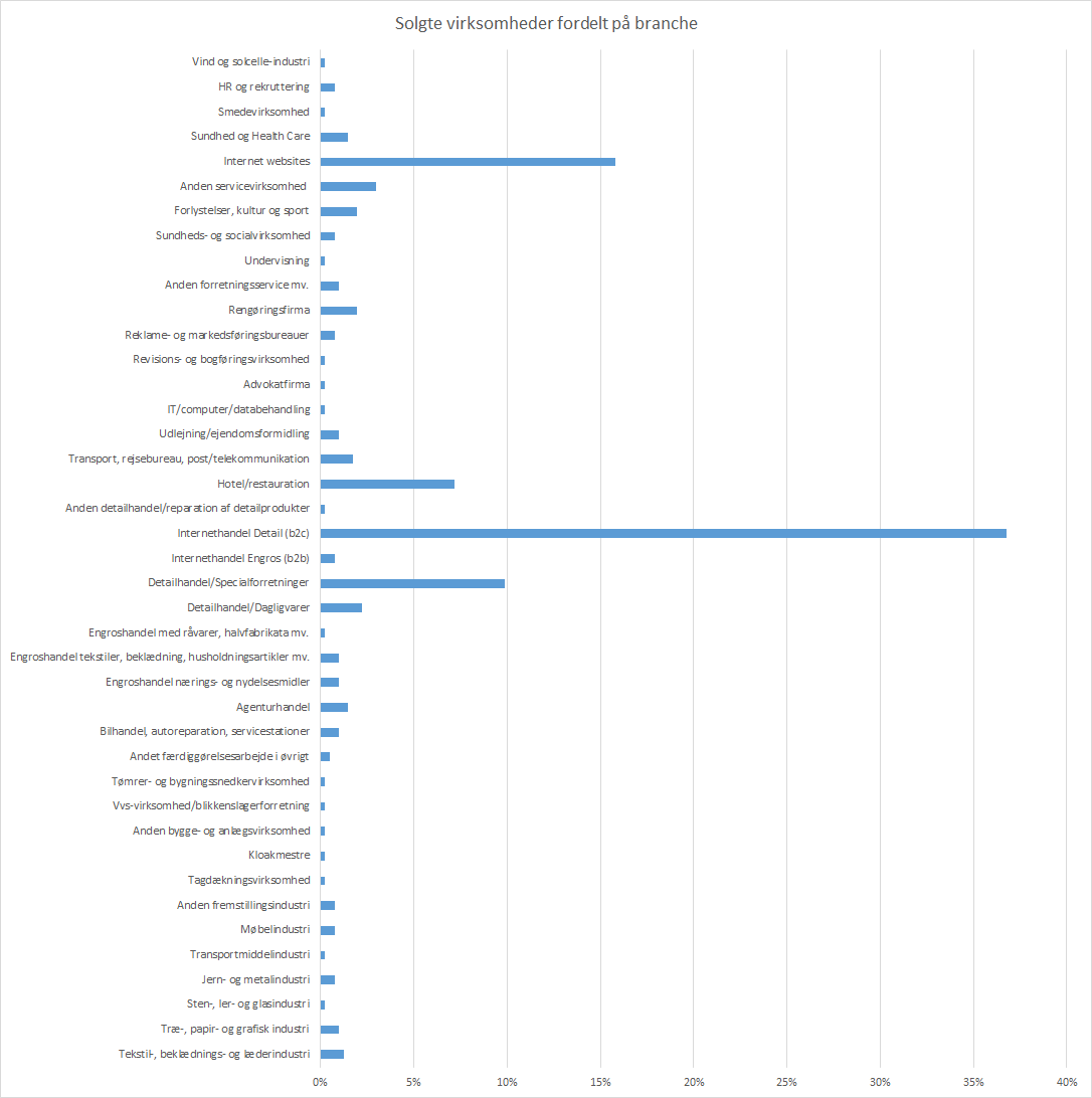 Ligesom det kunne ses under de forskellige typer af virksomheder, ses det også tydeligt her, at der er gang i internet handlen. Den branche hvor der er solgt flest virksomheder er online detailhandel og det vil altså sige webshops.