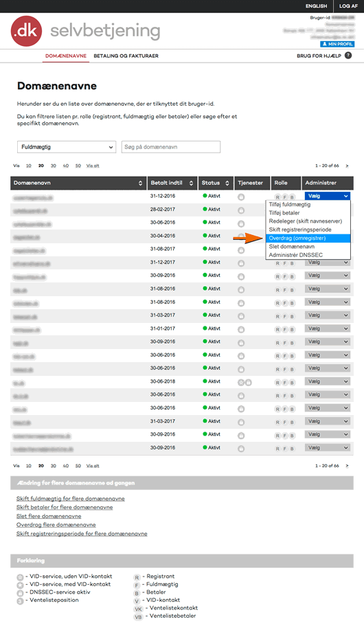 Vælg “Overdrag (omregistrer)” i menuen “Administrer” i listen over dine domænenavne til højre