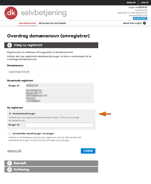 Kender du bruger-id’et på den, der skal overtage domænet, vælg “Anmod kendt bruger” og indtast bruger-id’et. Kender du ikke bruger-id’et, vælg “Anmod ikke-kendt bruger / ny bruger” og indtast en e-mailadresse. Klik på VIDERE.