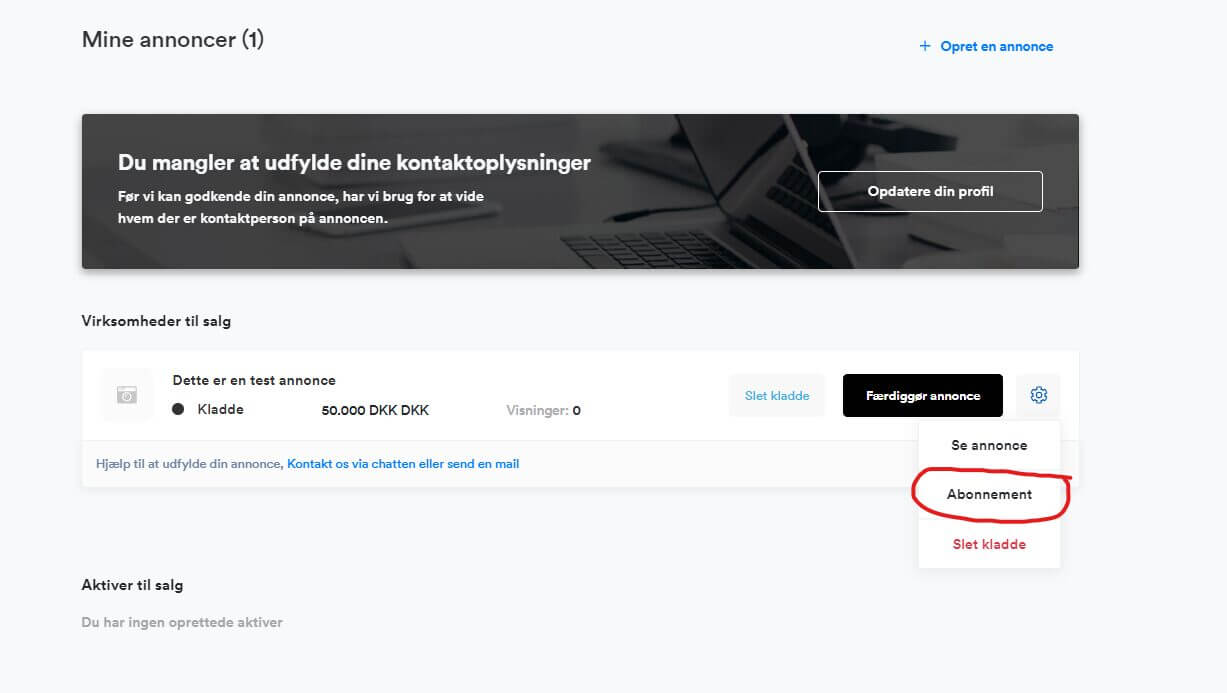 Har du allerede oprettet din annonce, skal du klikke på “Min konto” og derefter “Mine annoncer”. Her kan du klikke på det lille tandhjul ud for den annonce, du gerne vil købe en Boost- eller Premium-pakke til. Klik derefter på “Abonnement” i den menu, der dukker op.