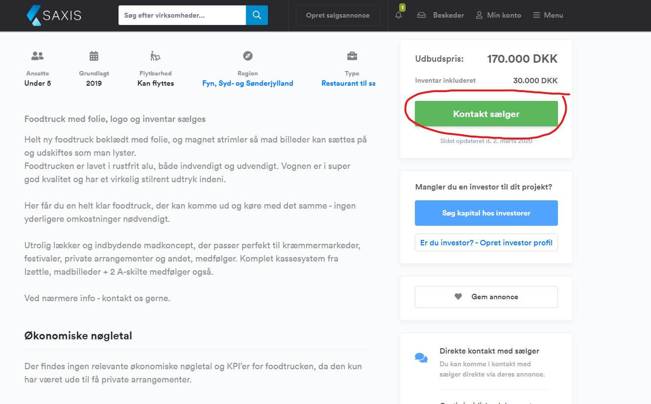 Når du ser en annonce på Saxis, som interesserer dig, skal du kontakte annoncøren direkte ved at klikke på knappen ‘Kontakt sælger’ på selve annoncen.