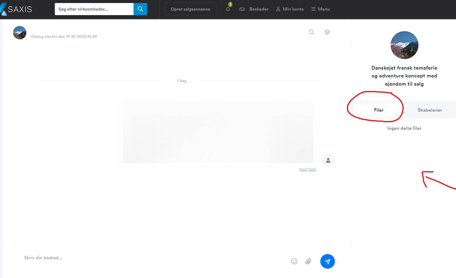 Når en person har sendt en fil til dig på Saxis, kan du i samtalen se en knap i højre side, hvor der står “filer”. Her kan du se alle de filer, der er delt i samtalen: