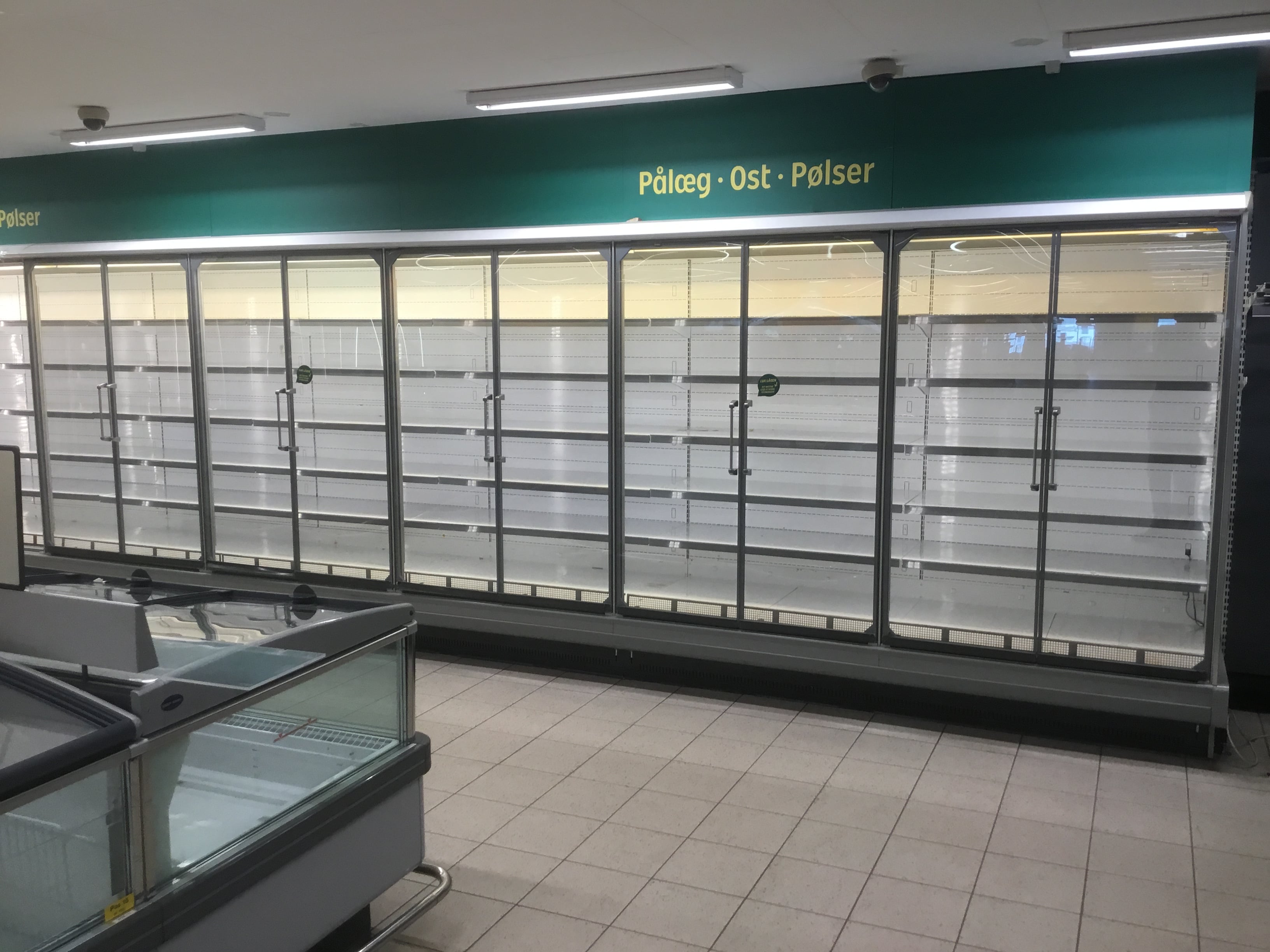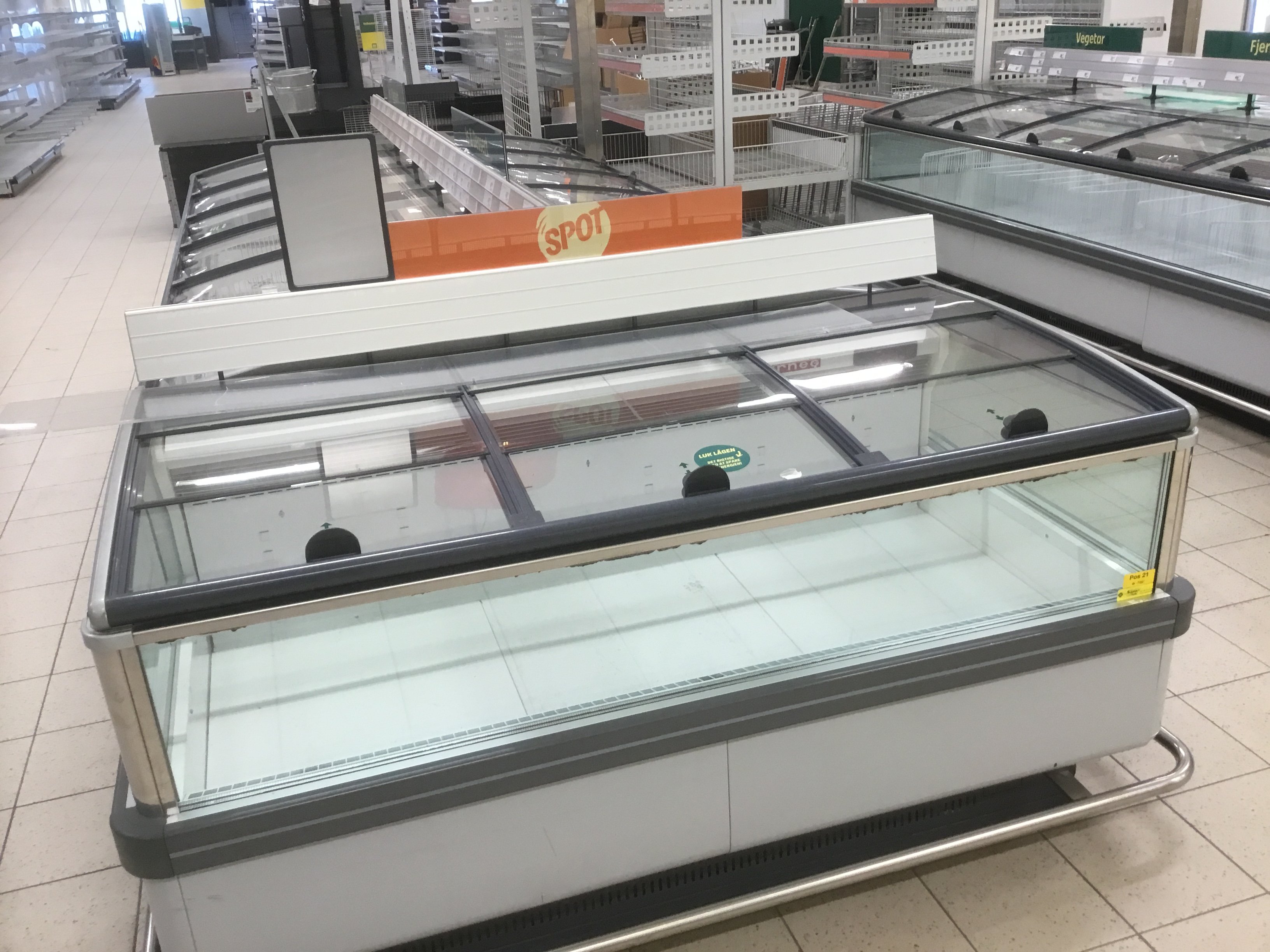 Køber afhenter i Svendborg.Antallet af dele er ikke gjort præcist op, men der er løst inventar fra en 865 m2 stor butik. Ved en hurtig gennemgang har jeg talt følgende dele, der er tale om en cirka optælling, og der er nok noget der mangler at blive talt med. 21 sekt Kølemontre Ca. 130 bagvægge til hyldemonteringer, en del på T stativer Ca. 500 forskellige hylder og ophæng 13 køle sektioner bag glas 2 kasseliner uden kasseapparater 1 rullebord til flaskesortering En del podier og skabe m.m. 1 Rulle stativ til udendørs 1 Pengeskab Og sikkert en del mere når først vi kommer i gang med at pakke det hele sammen.