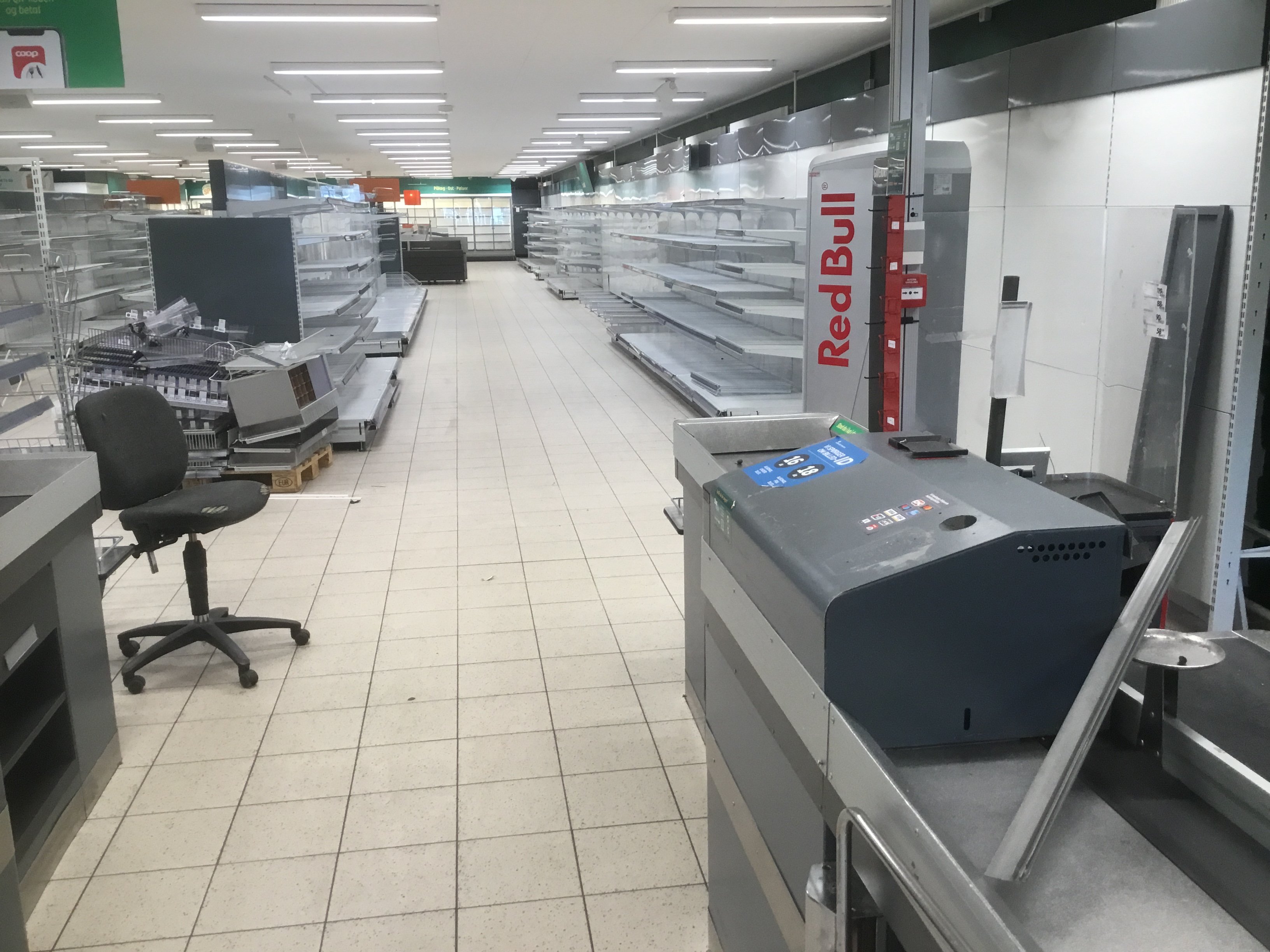 Alt inventaret fra en lukket COOP 365 butik. Butikken havde lejemål i vort lokale 865 m2, i forbindelse med butikkens ophør, aftalte vi, at inventaret kunne blive stående til en eventuel ny lejer. Vi har endnu ikke fundet en ny lejer, hvor vi sælger alt inventaret for kr 150.000,- + moms