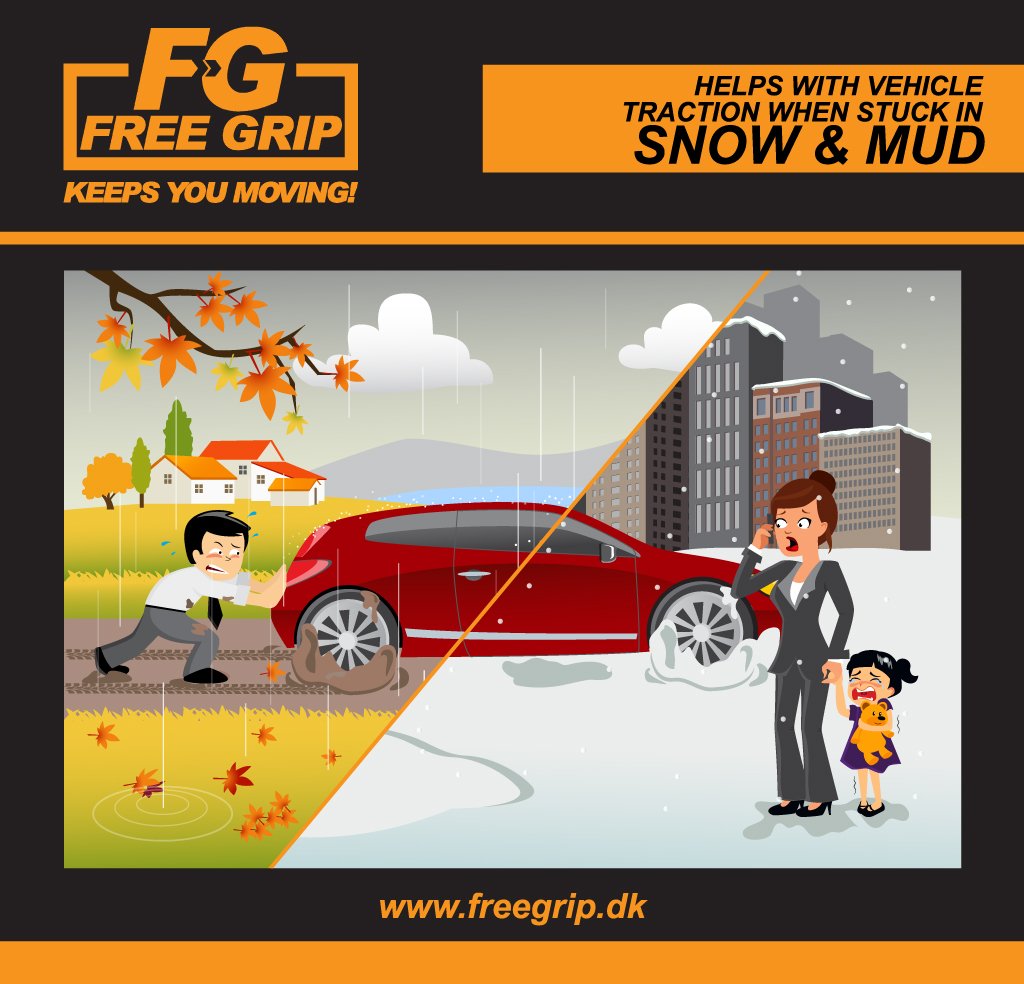 Free Grip er en løsning til biler, som er kørt fast i sne, mudder og sand. I stedet for at ringe efter hjælpe eller skubbe bilen fri – har vi lavet Free Grip, som sikre et solidt underlag til biler så du let og simpelt kan køre videre.