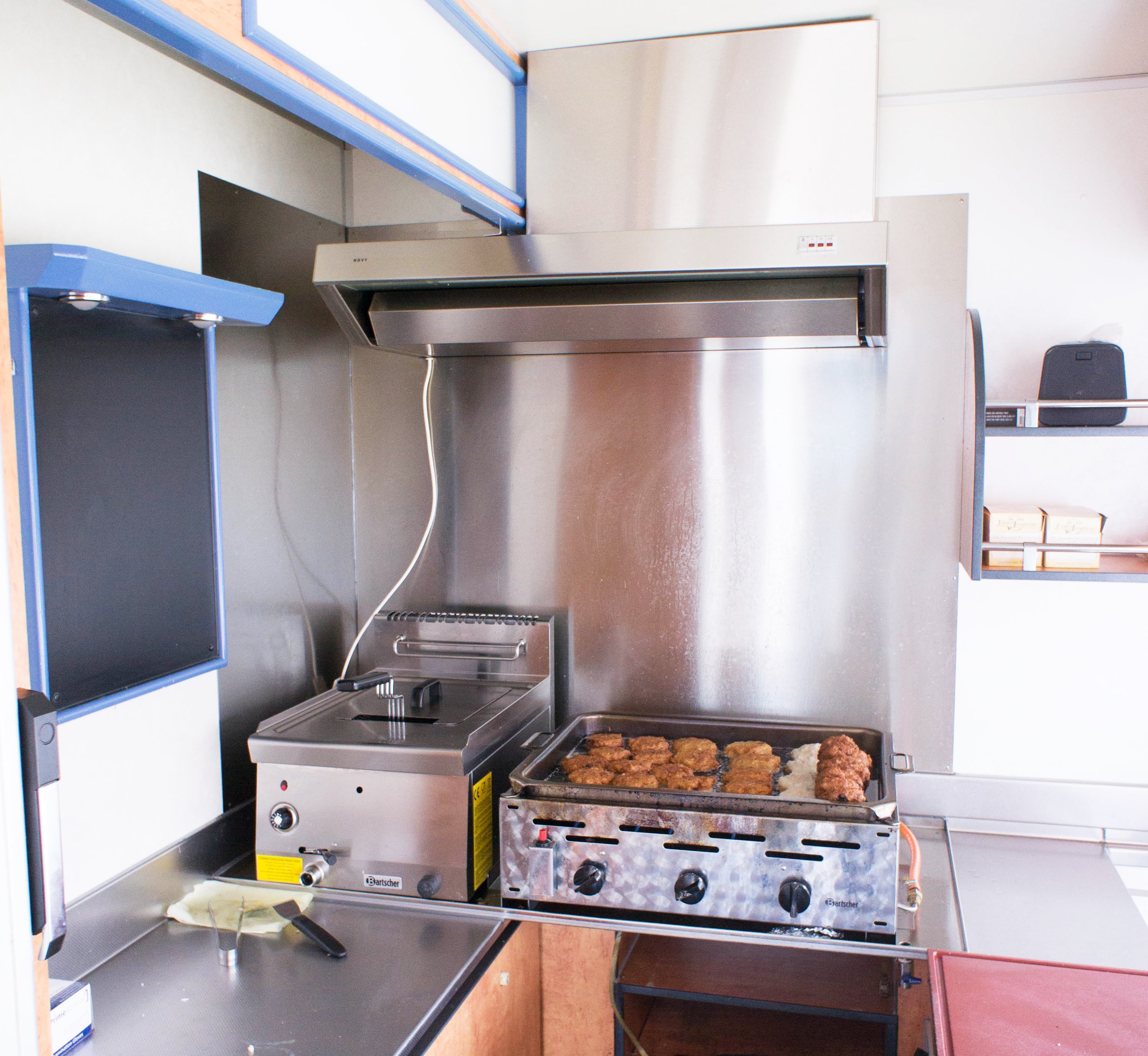 For enden af bord/køledisken er der installeret helt ny industriemhætte, ny 8 l. frituregryde og ny stegeflade med 3 brændere samt rustfrit stål på væggen.