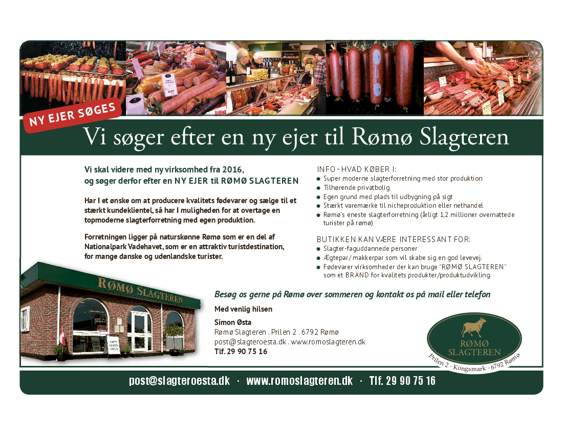 Rømø Slagteren er en moderne slagterforretning, hvor vi har et super salg til turister og lokale. Der er stor mulighed for enten nethandel eller nicheproduktion, da beliggenheden på Rømø giver en god historie til produkterne.