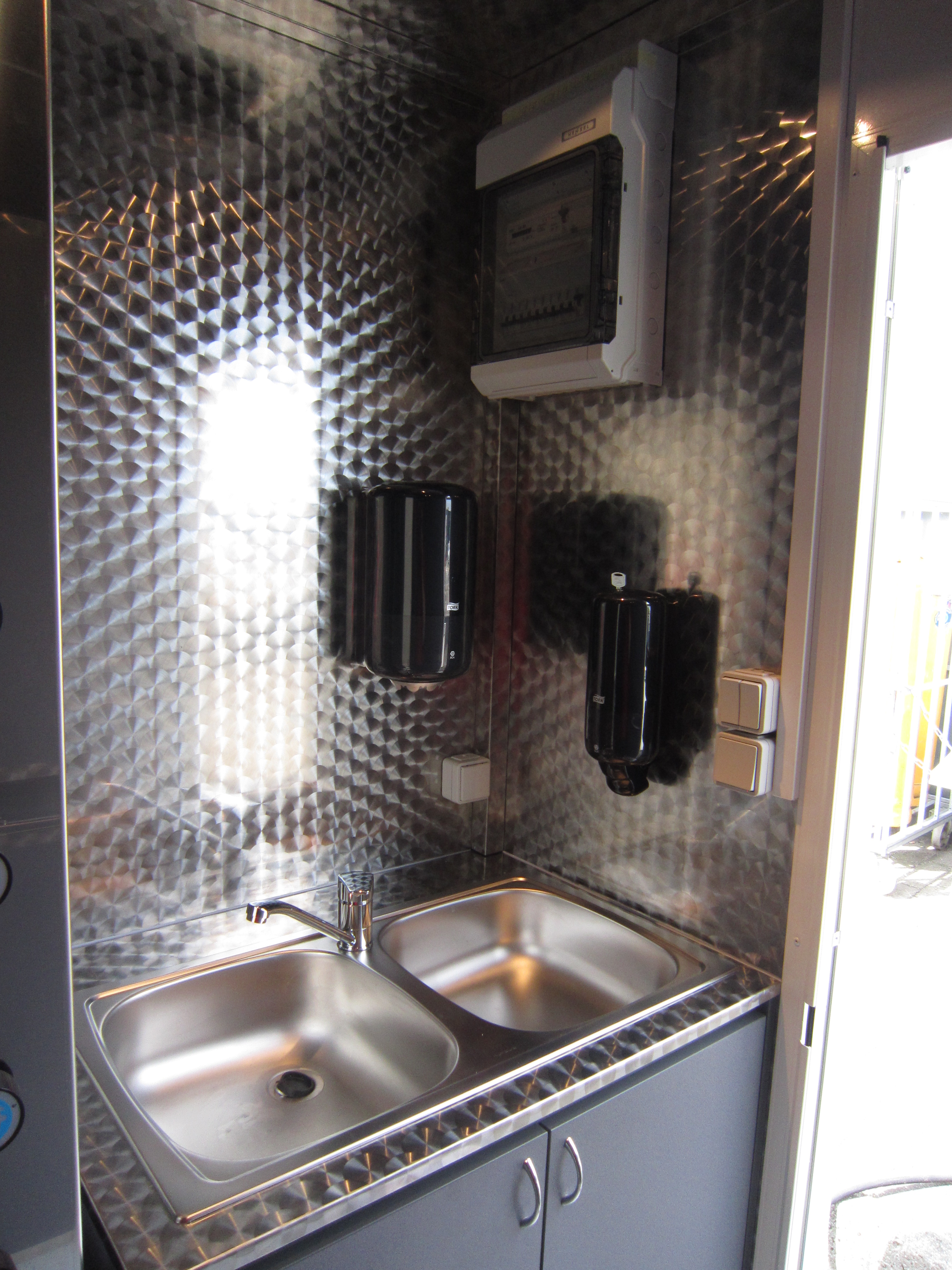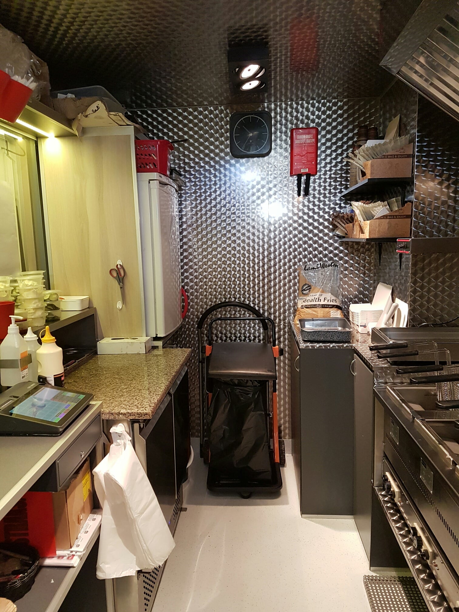 Salgsvognen er indrettet med stor gasgrill, friture med 3 kar, sandwichbord med køl, stort køleskab med plads til spydede kyllinger, fryser og rigtig god bordplads.