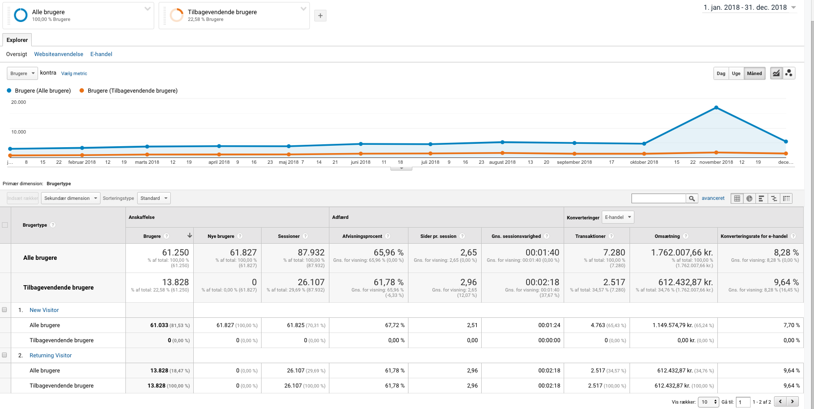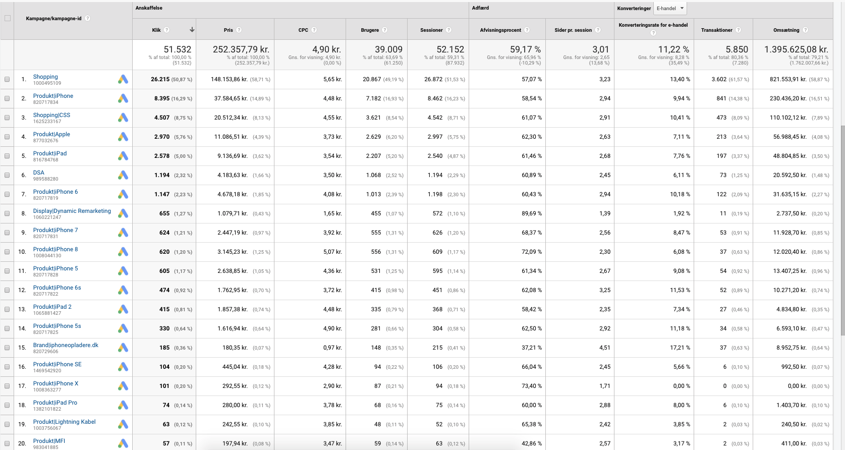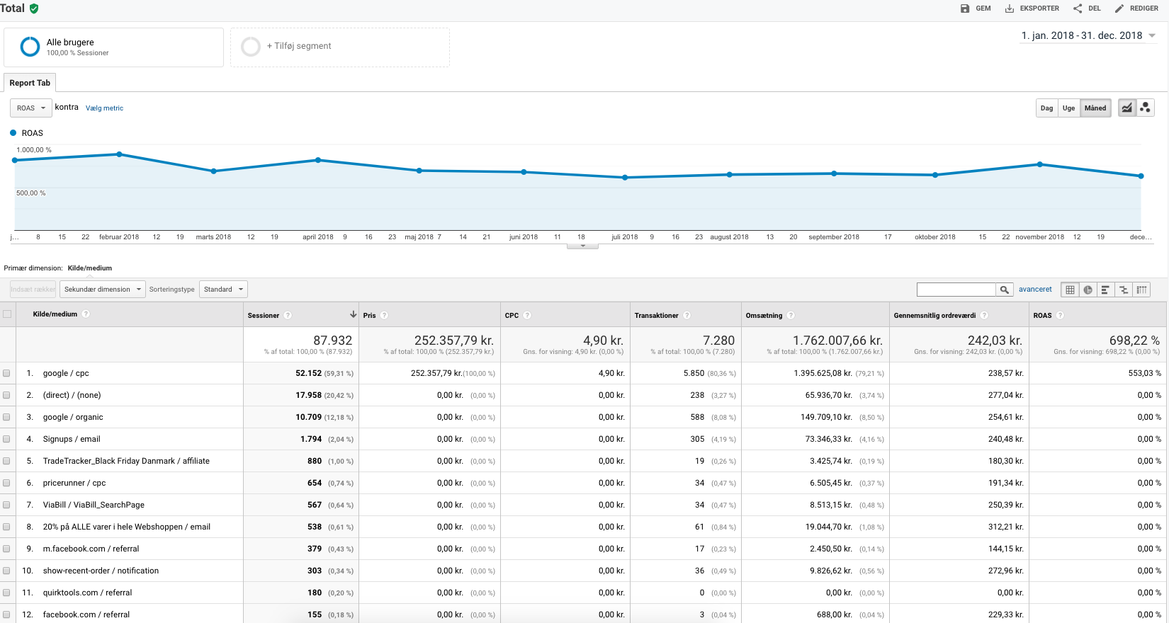 • ROAS fra Google Adwords hele 2018 (gennemsnit) = 553,03 %
