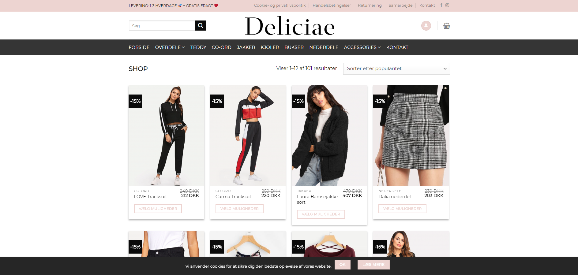 Vi testede vores webshop af i Januar 2019 og solgte via. facebook & annonceringer for godt og vel 11.000 kroner første måned. Deliciae har en fast leverandøraftale som ved køb kan overtages. Selve tøjet er fra Kina og ved bestillinger er det inklusiv gebyrer til told, fragt osv.
