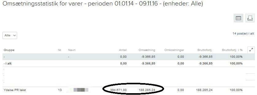 - Omsætningen er en del højere end i screendump, da Artikel-tjenesten ikke har været selvstændig varekode i E-conomic hele tiden.