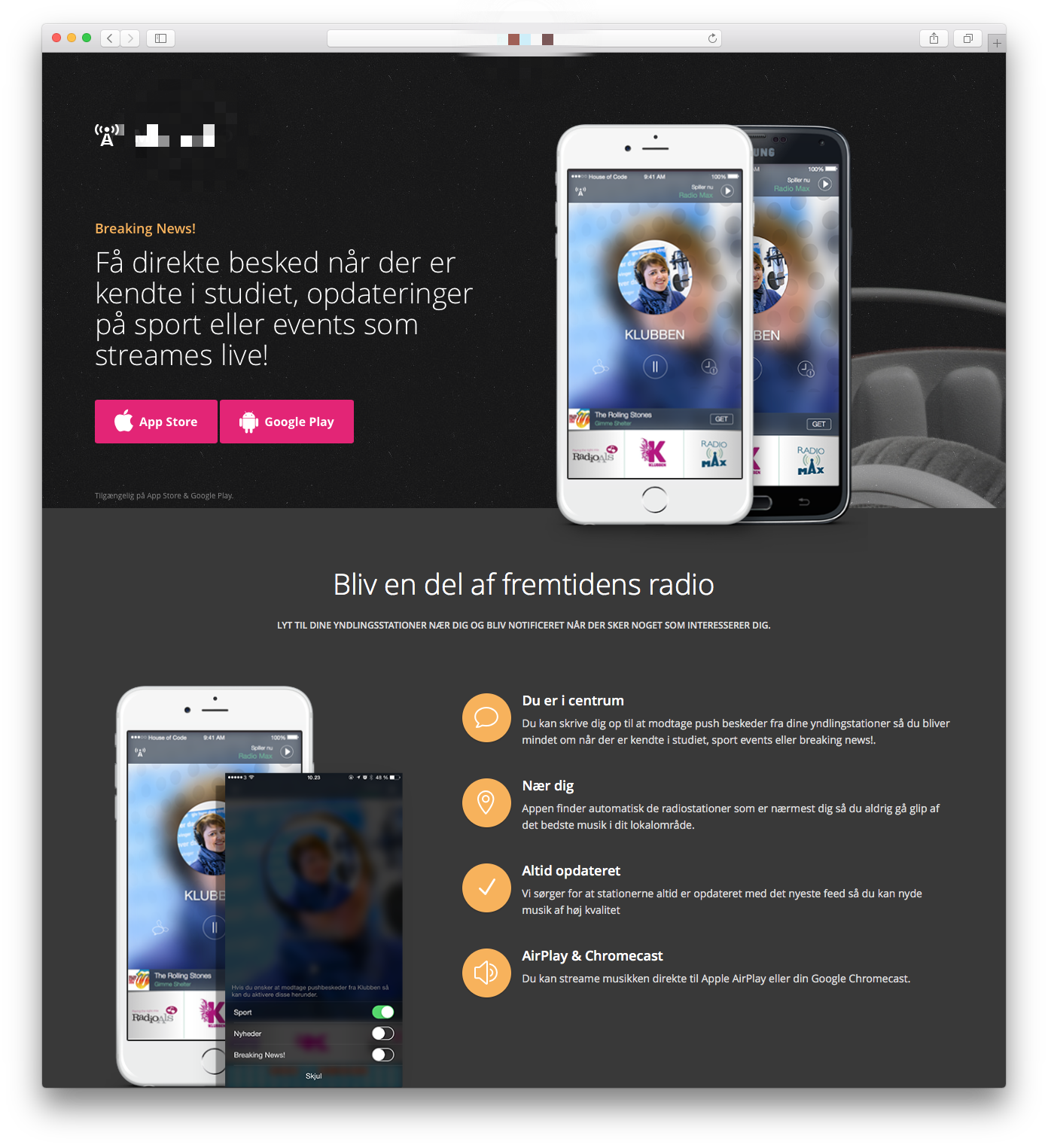 - Website som fungerer som landing-page som forklarer om konceptet og med links til downloads af app