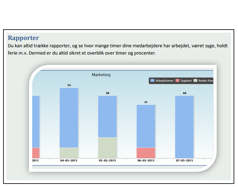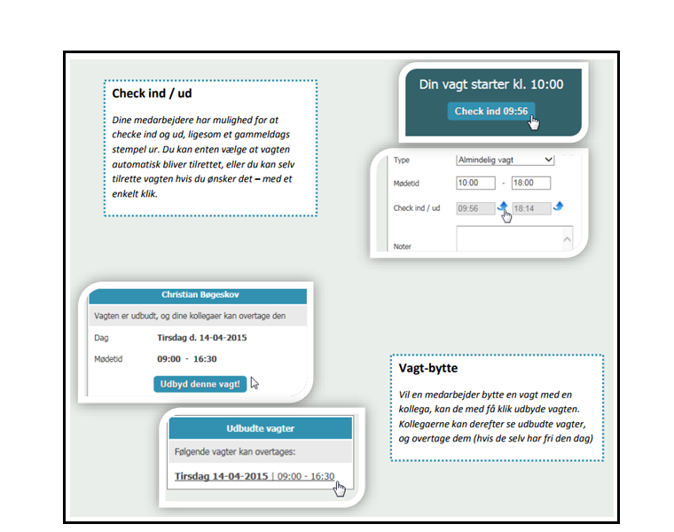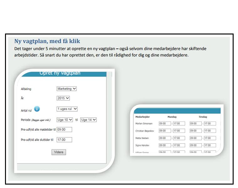 Systemet er ikke avanceret - det har de funktioner som 98% af kunderne skal bruge, hverken mere eller mindre. Til gengæld er det super brugervenligt, så en leder skal bruge mindst mulig tid på vagtplanlægning, sygdom, ferie osv.