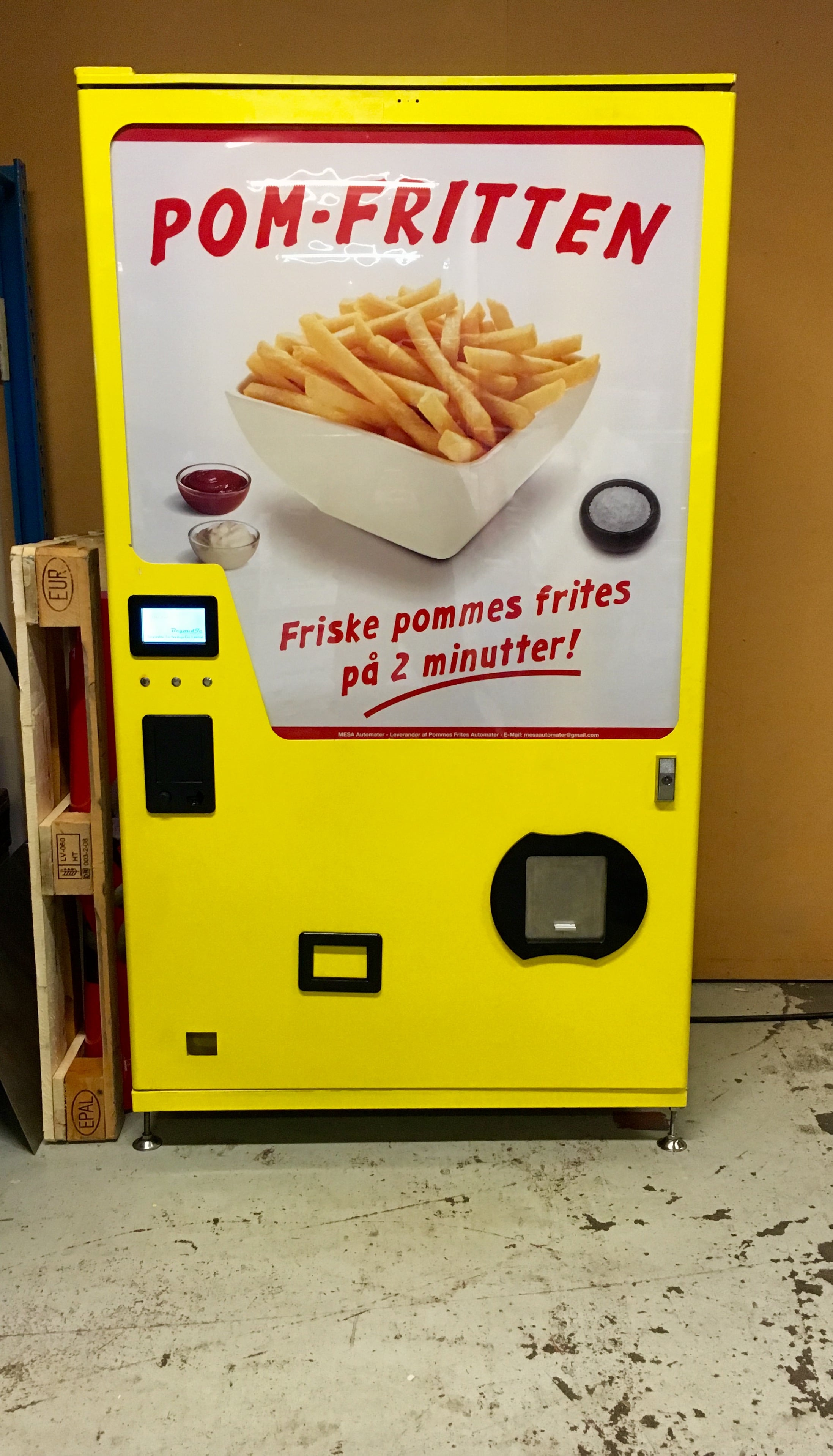 Dette er en fuld-automatisk pommes frites automat, som laver friske pommes frites på ca. 2 minutter ved indkastning af penge. Den har en indbygget fryser til opbevaring af frosne pommes frites, samt vægtskål og friture og ordner det hele selv.