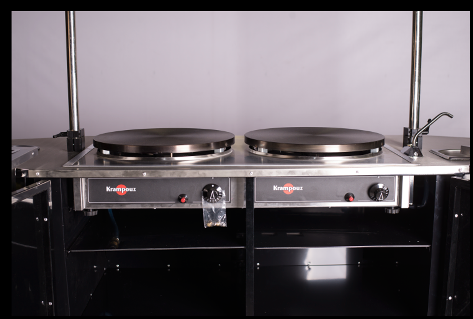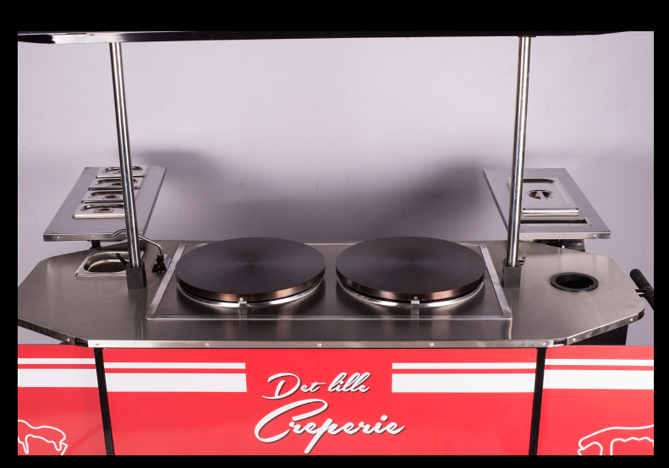 Topmoderne salgsvogn med alt nødvendigt udstyr af den bedste kvalitet. Vognen er speciallavet til salg af pandekager/crepes. Indberettet med integreret dobbel Krampouz jern, som er det ypperste inden for pandekagebagning. Professionelt gas jern med to støbejernsplader, produceret til intensivt brug. Derudover er vognen indberettet med koldvandshane, som er nødvendigt for at den eventuel kan fødevaregodkendes. Vandhanen kører på 12 volts batteri, som sidder skjult under bordpladen. Der er desuden monteret en diskret batterimåler på siden. Vognen er derved fuld funktionsdygtig uden strøm.