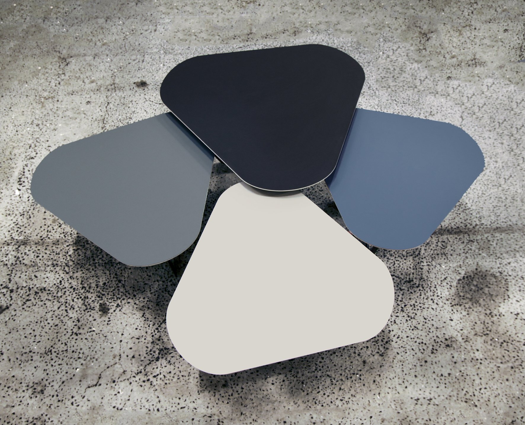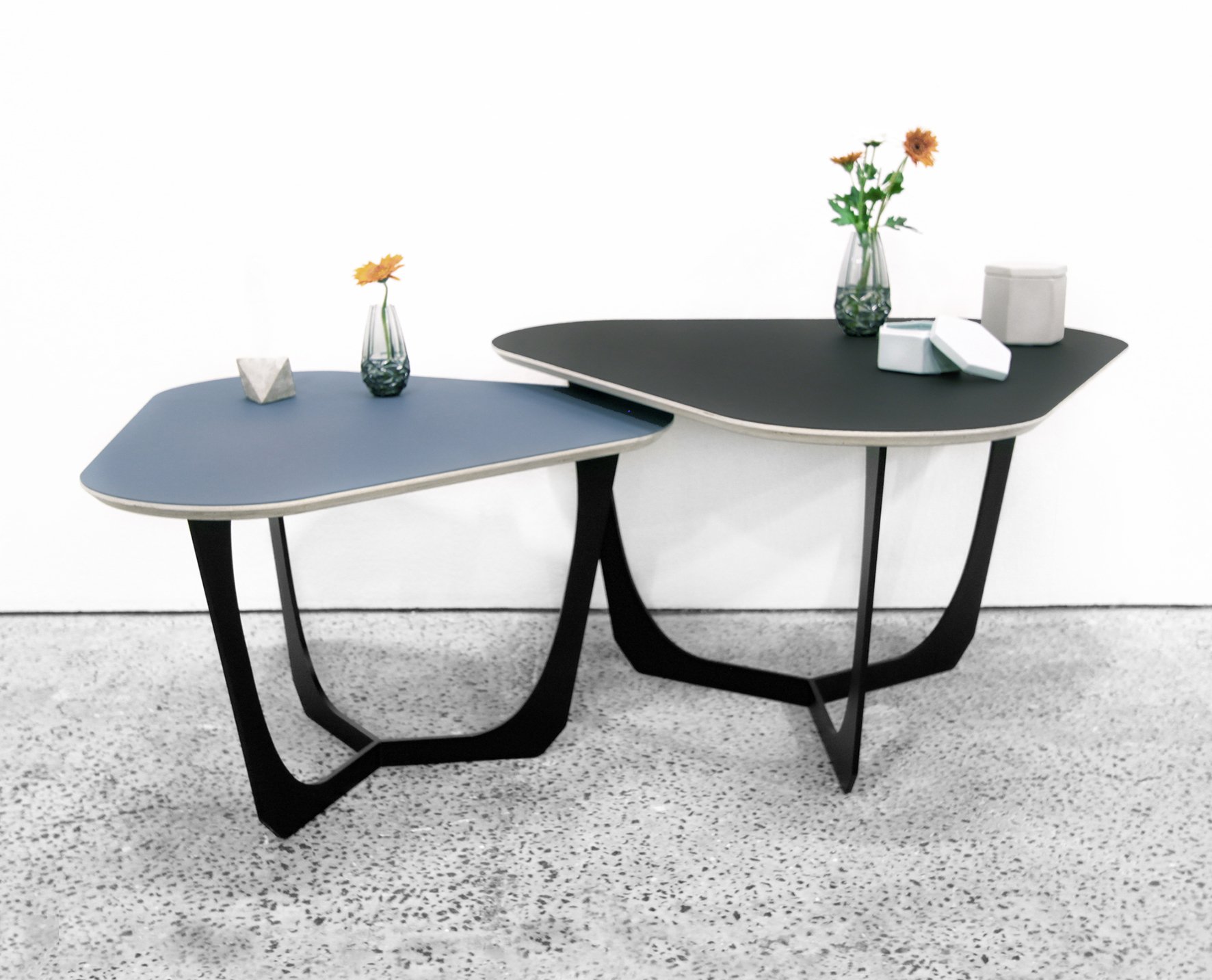 Bordene er flotte til et hvert moderne hjem, til lounge området, på kontoret eller på en stilfuld café. Bordpladen i birkekrydsfiner er med skrå underside, hvilket giver et slankt og elegant udtryk. Oversiden er belagt med linoleum - en mat og ridsefri overflade, og undersiden er belagt med sort laminat. Stellet er fremstillet i sort pulverlakeret stål og er yderst slidstærk. Bordene produceres med 4 forskellige farver linoleum og i to højder.