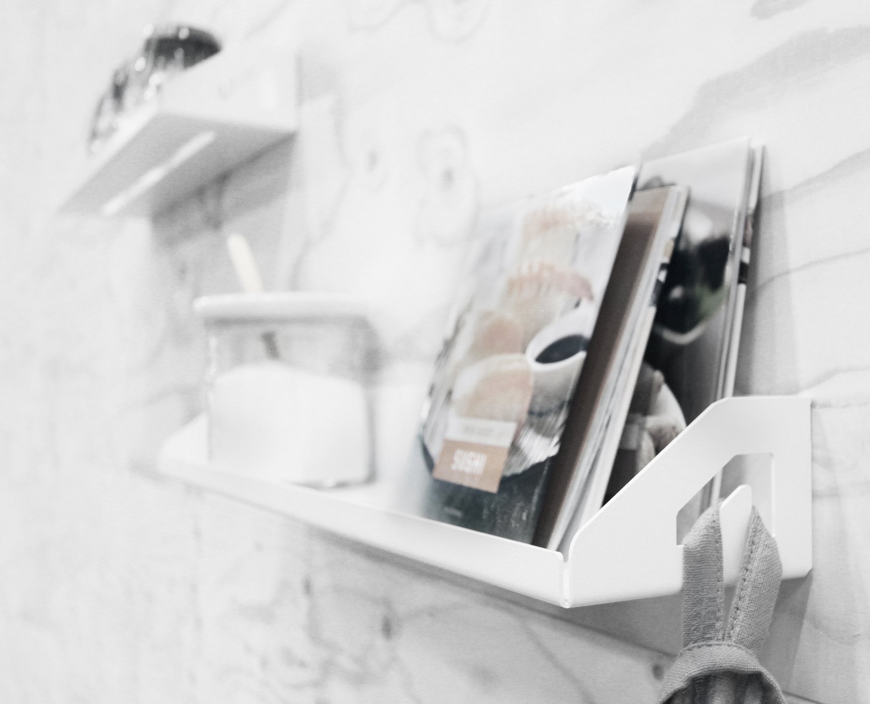 Hylden er bl.a. perfekt til det lille køkken, på badeværelset eller i entréen. Den har små lækre detaljer, som udskæring i siden der kan bruges som krog til viskestykke, håndklæde, nøgler, smykker osv. Udskæringen i bunden binder visuelt udskæringerne i siderne sammen og gør bl.a. at glas kan tørre indvendigt efter opvask eller at en billedramme står elegant på midten af hylden. Den er pulverlakeret og derfor yderst slidstærk.