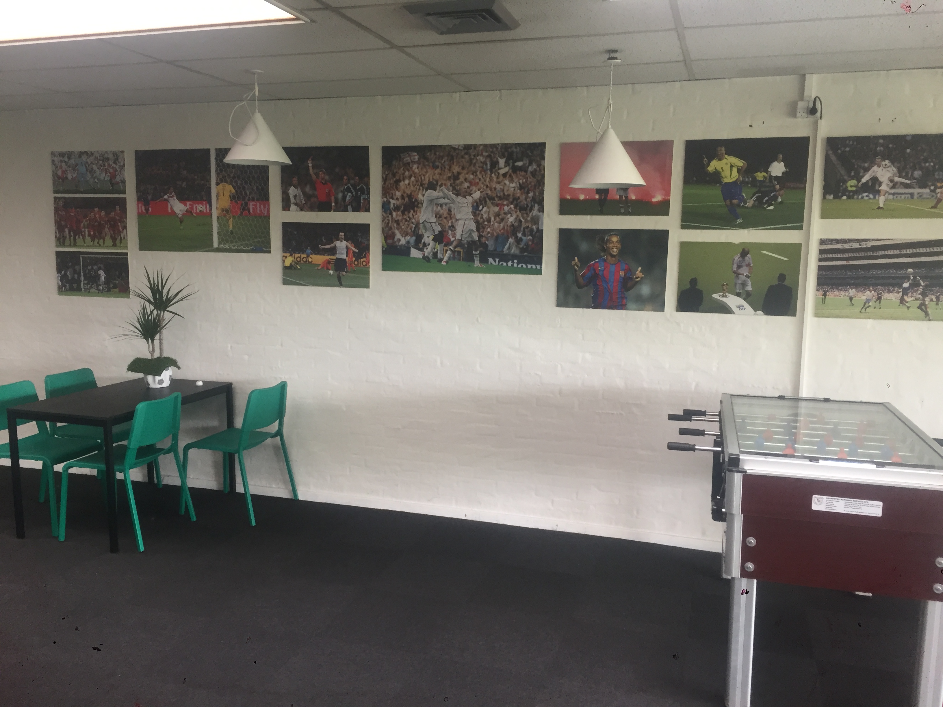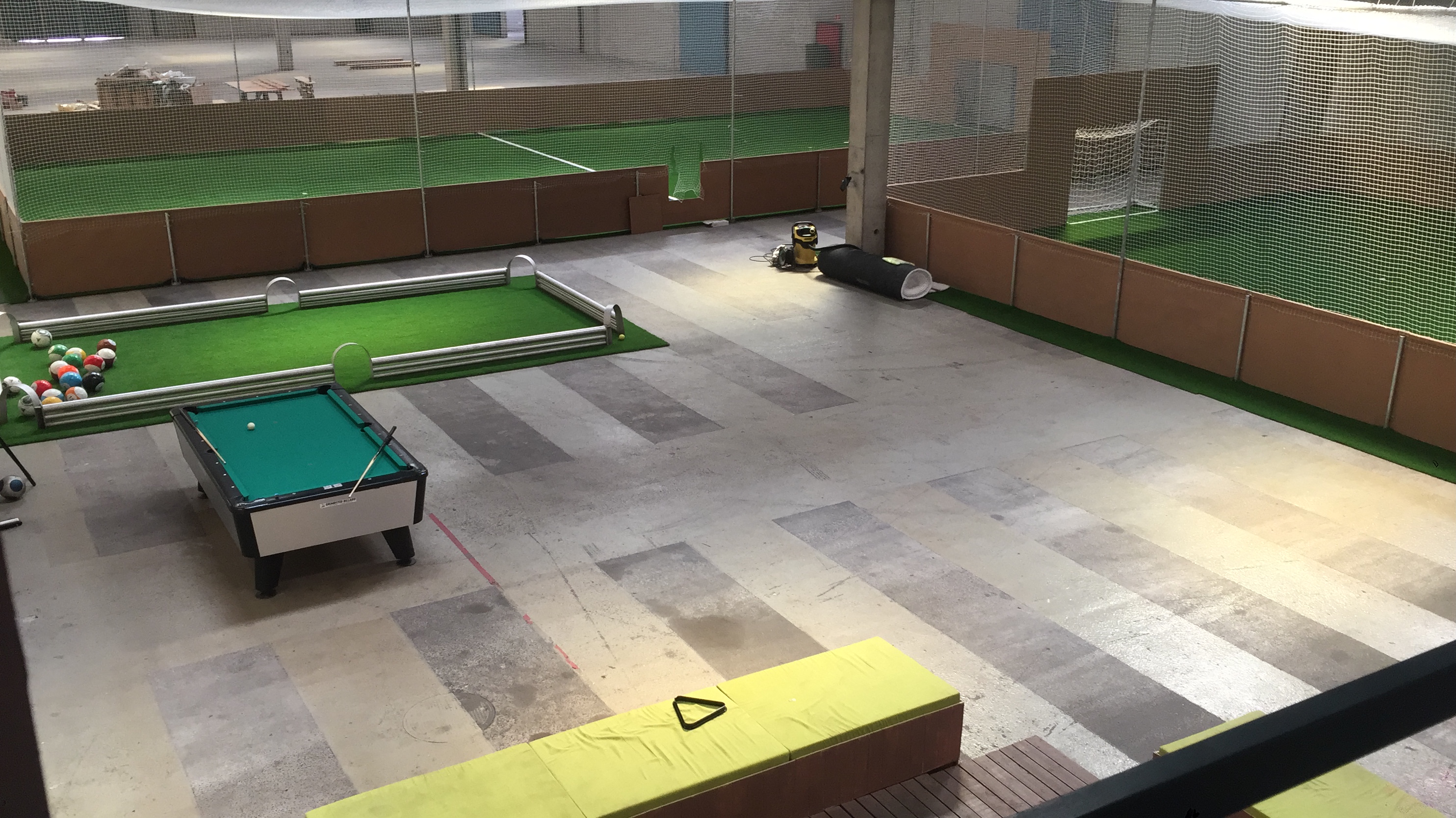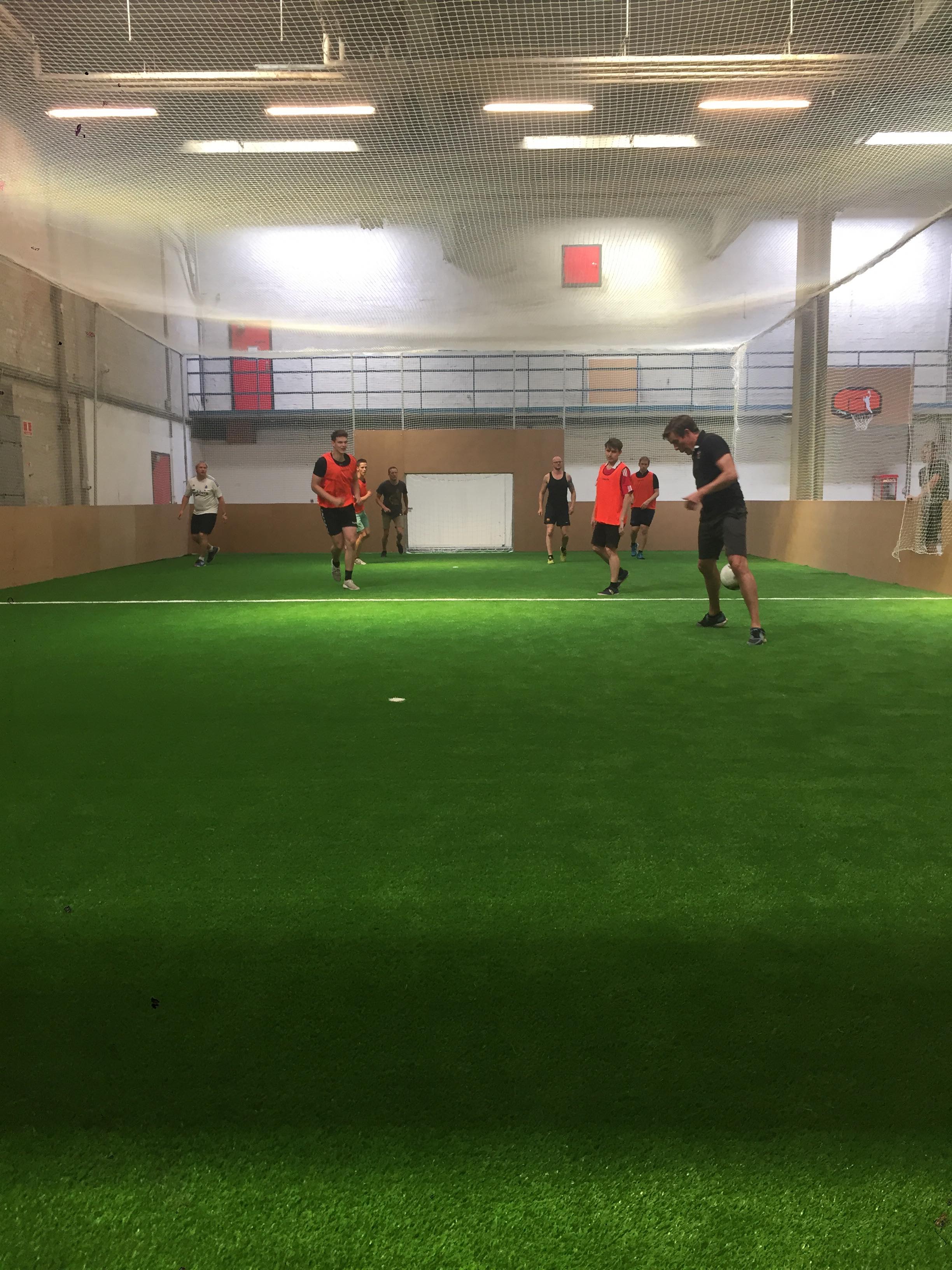 Indendørs fodboldcenter med to kunstgræsbelagte fodboldbaner omkranset af net og og bander, fodboldpool-bane, og tilhørende café/lounge/festlokale indrettet i fodboldtema, med poolbord, storskærm, sofaområde, bordtennisbord, køkken, toilet/badefaciliteter m.m.