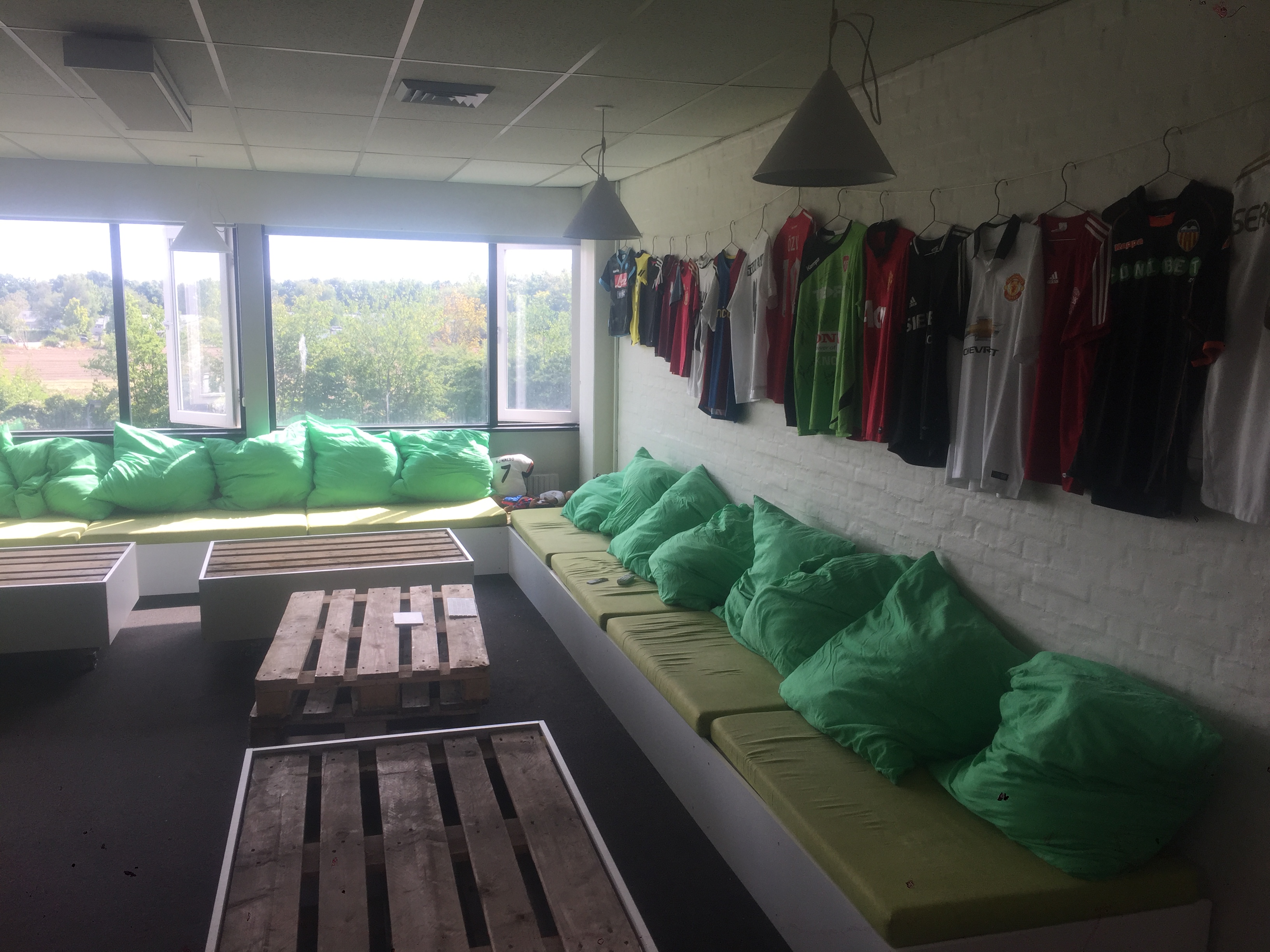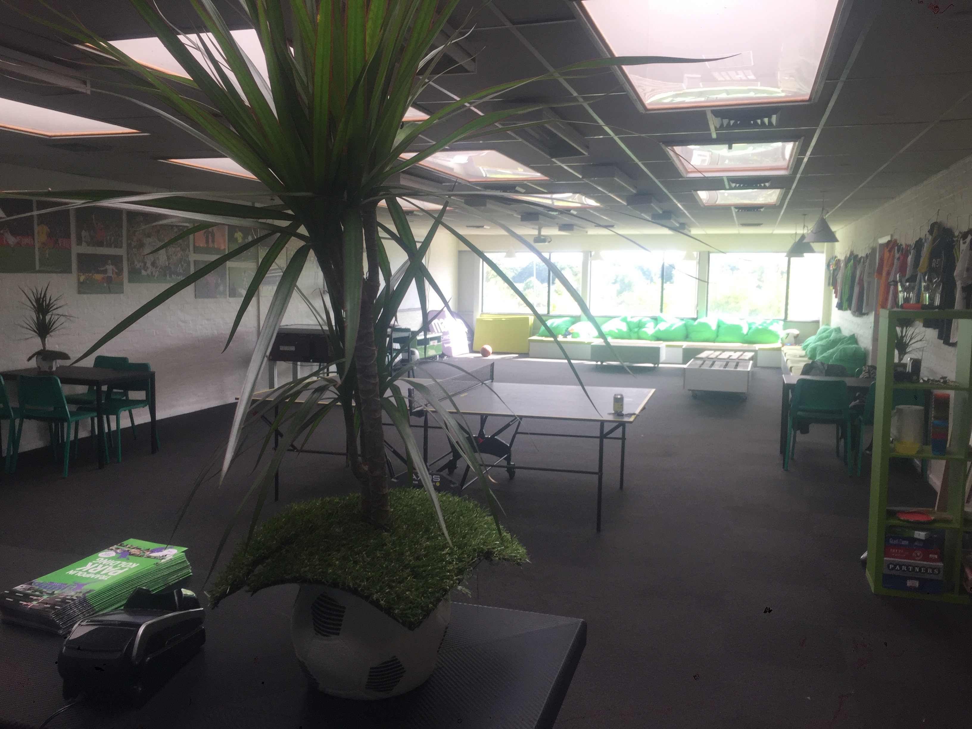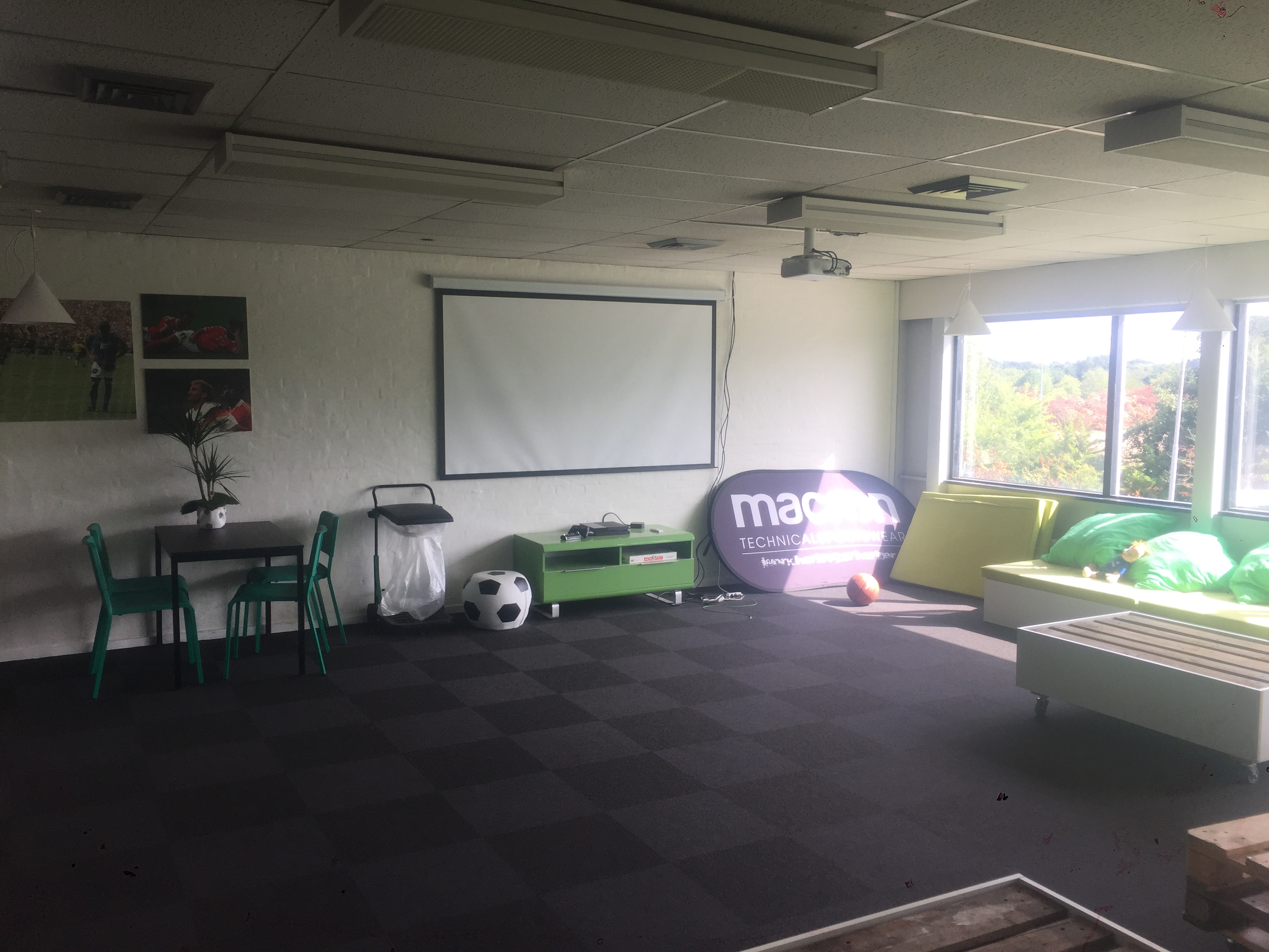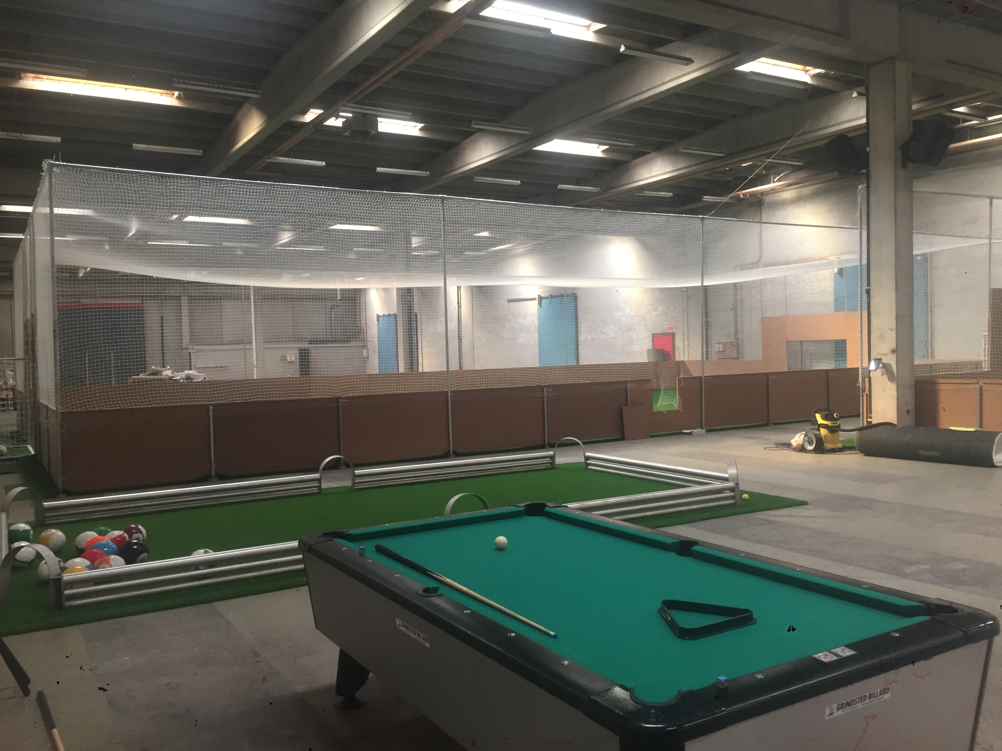 Indendørs fodboldcenter med to kunstgræsbelagte fodboldbaner omkranset af net og og bander, fodboldpool-bane, og tilhørende café/lounge/festlokale indrettet i fodboldtema, med poolbord, storskærm, sofaområde, bordtennisbord, køkken, toilet/badefaciliteter m.m.