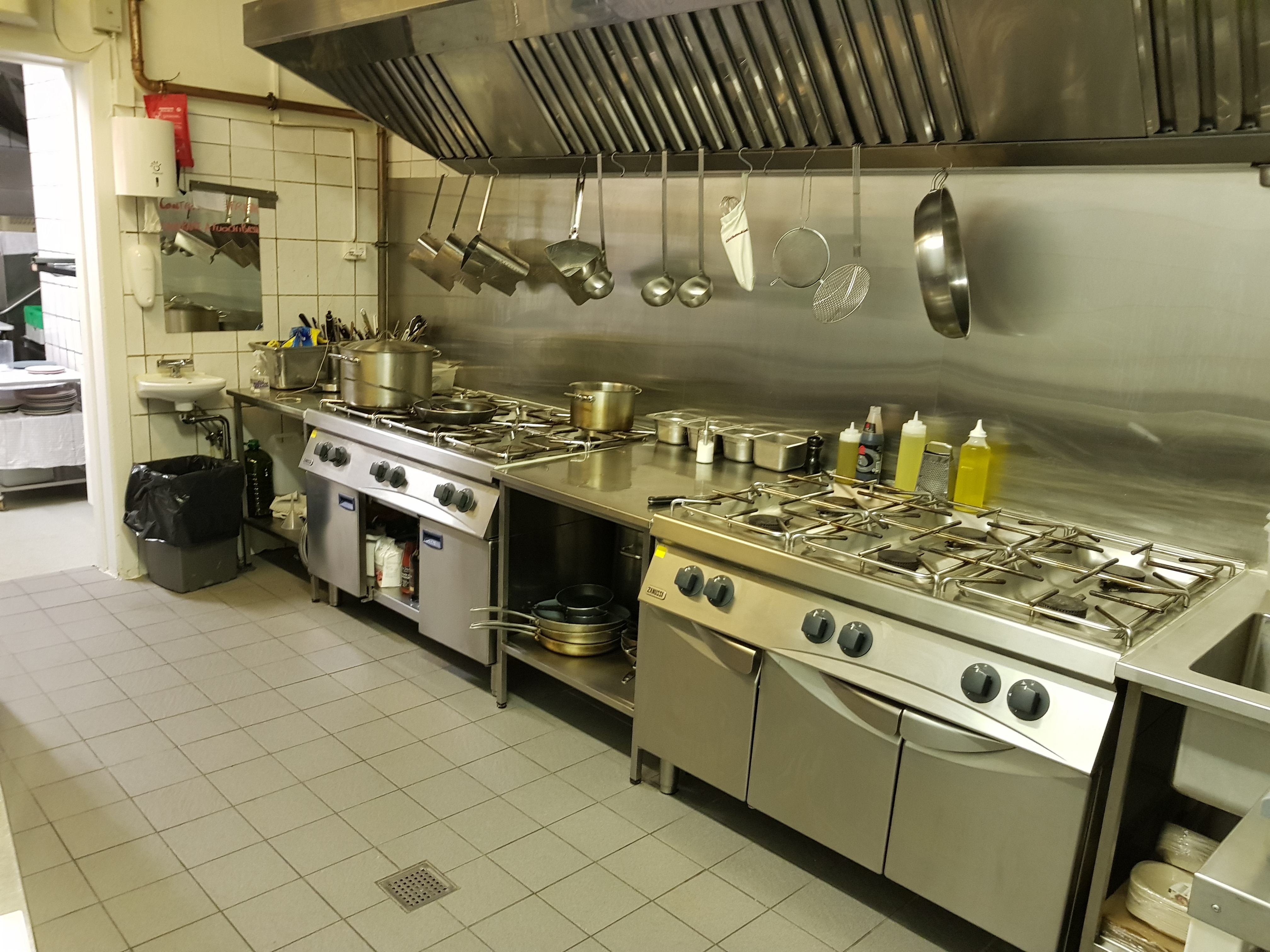 Stort køkken med 3 køleskabe, lille fryser ,ovn og 12 gas blus .