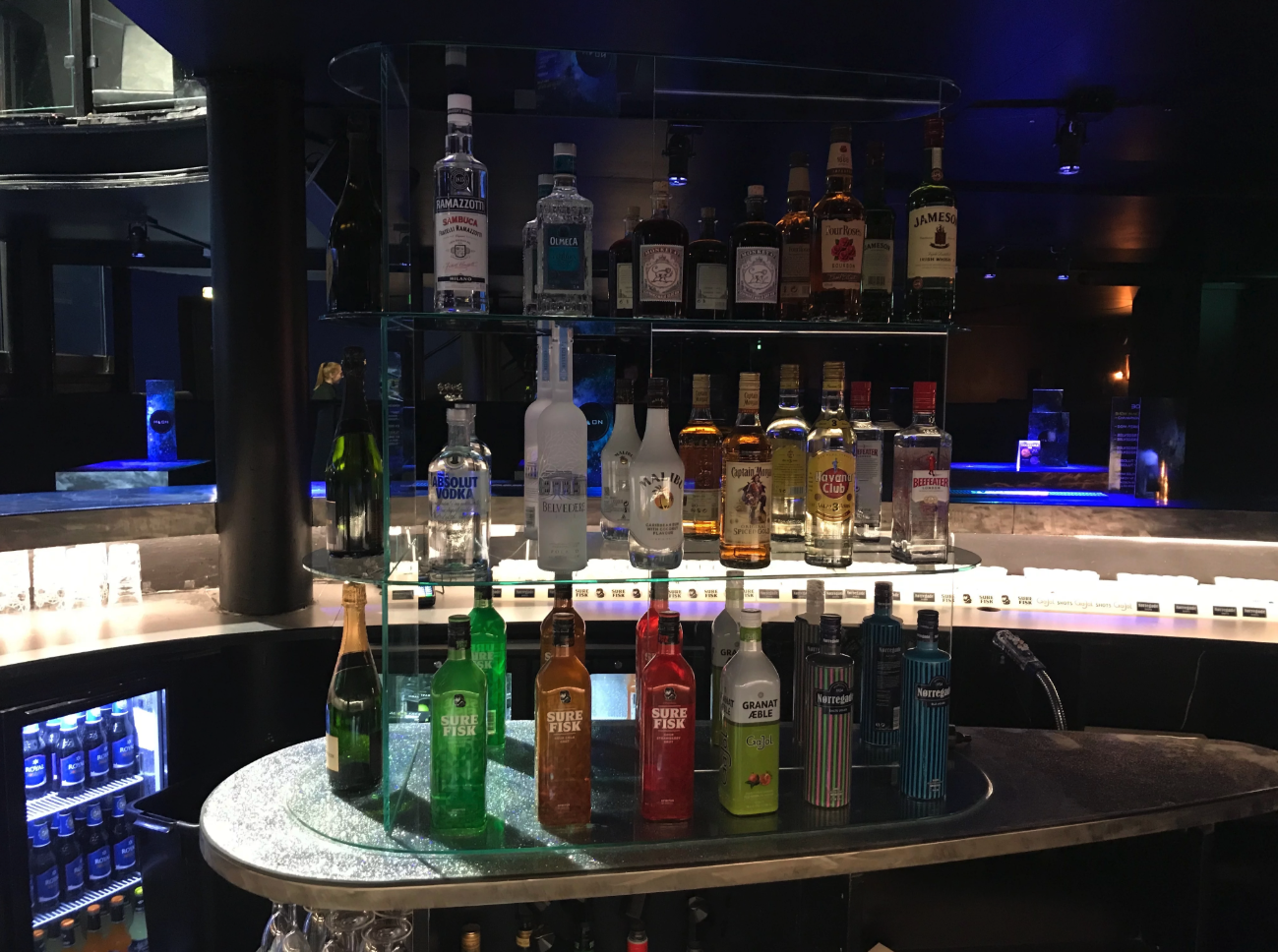 Fustageanlæg med cocktails fra Cuba Cocktails, postmix system fra Royal Unibrew, førstesal med glasgelænder, så man kan sidde og kigge ud over dansegulvet.