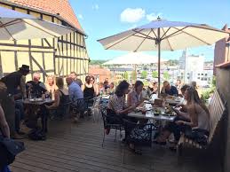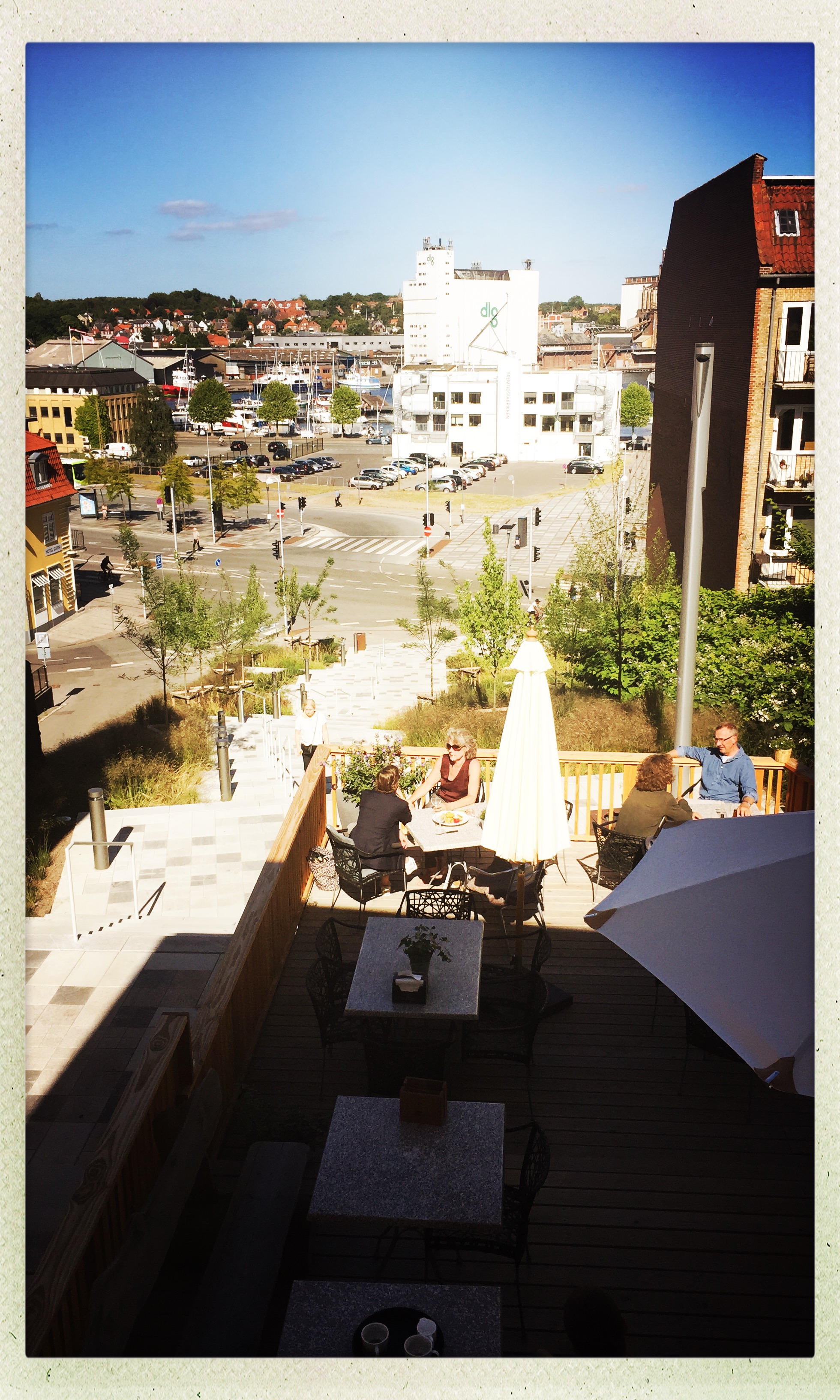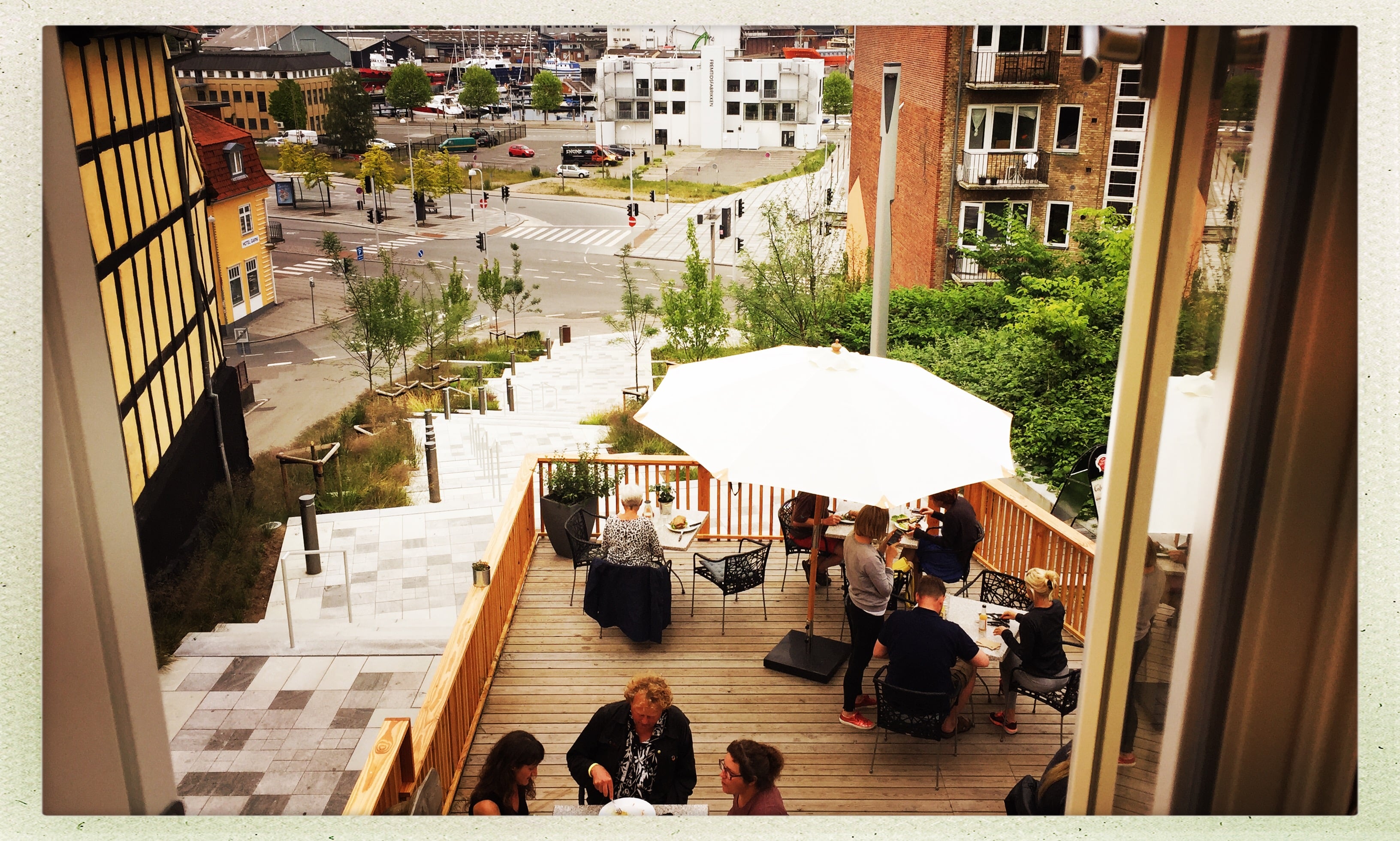 Lille moderne cafeteria med fortovs-servering på gågaden og stor solterrasse, i læ for vesten-vind og med udsigt over Havnetrappen og Svendborg Havn.