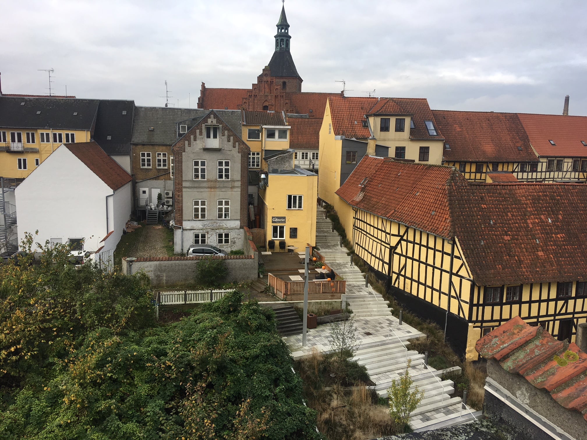 Vi faldt for beliggenheden som er helt unik, både rent æstetisk men også ifht. bybilledet. Cafeteriet ligger centralt i gågade med direkte adgang for de folk som kommer op i byen fra parkeringshus, lystbådehavn og selve havnefronten med busser og banegård, disse ligger lige nedenfor Havnetrappen. Der er et godt samarbejde med de andre erhvervsdrivende i gågaden og vi er stolte af mange små unika butikker, dette tiltrækker mange handlende hele året rundt.