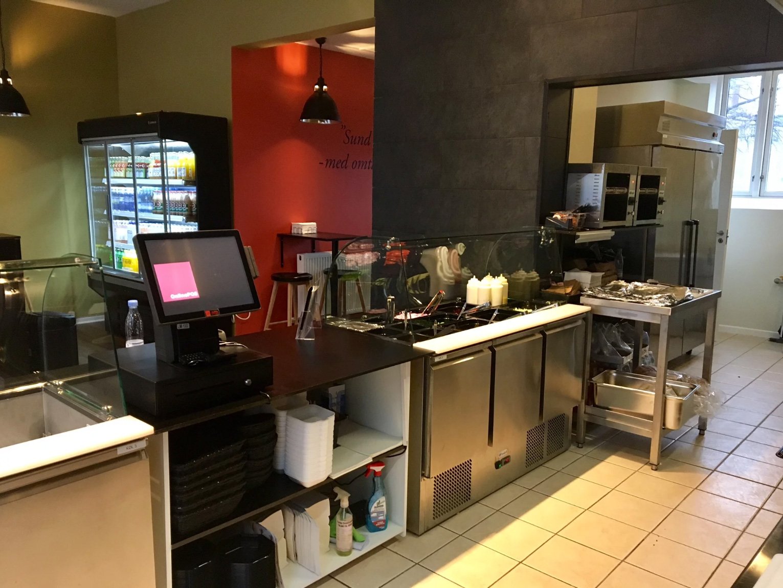 Udover fuld inventar i restauranten med borde og stole mm er der investeret i stor 1,3 meter bred display til alt sodavand.
