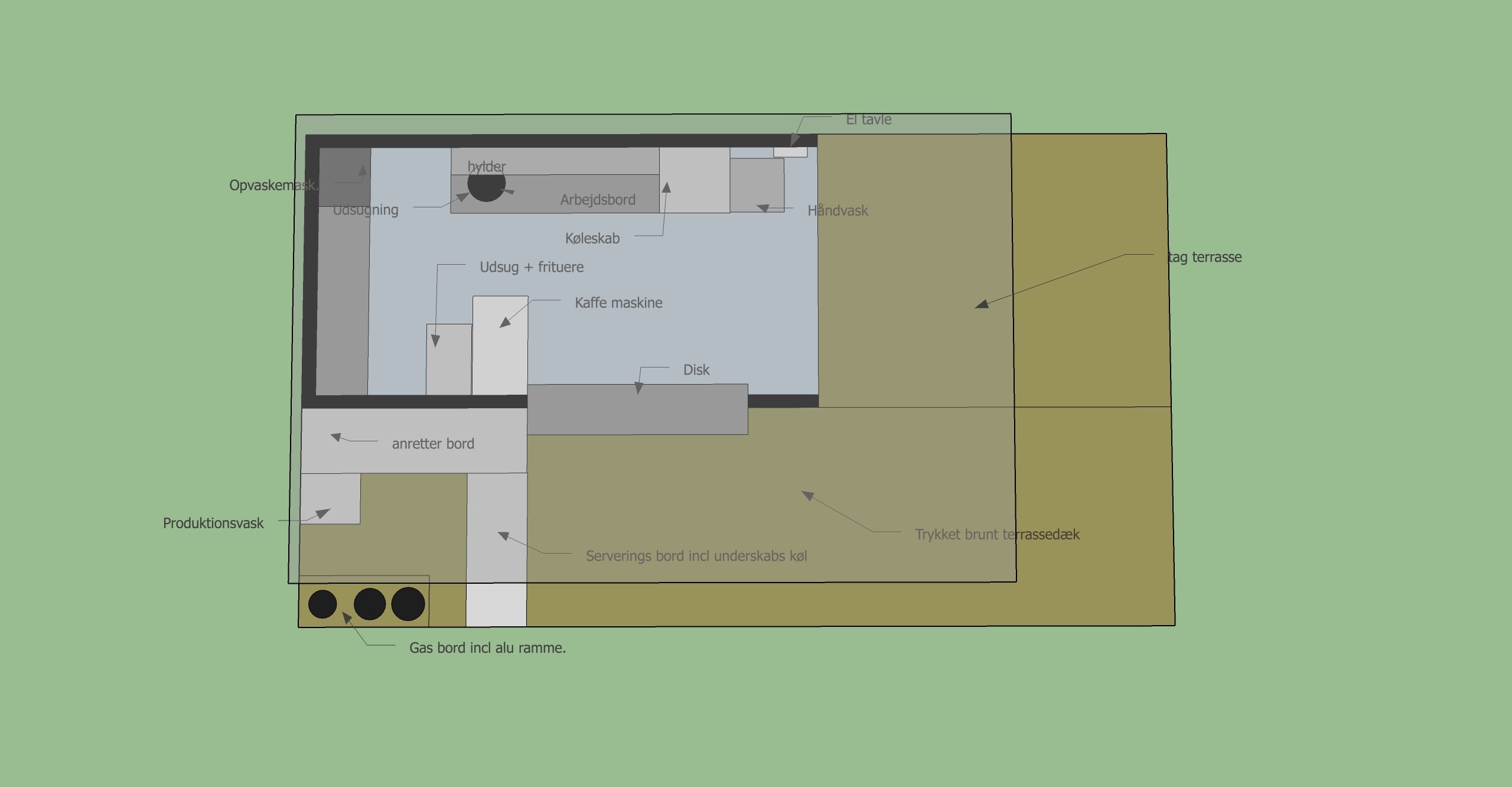 Inventar: Ken opvasker, specialbyggede borde, udluftning, gasblus (stort), køleskab (glas), bord til udekøkken, hyldesystem