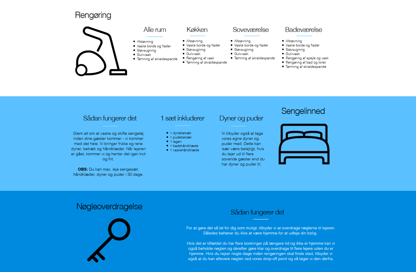 Innovativt koncept som appellerer til personer der udlejer sin bolig i Københavnsområdet og hjælper med alt besværet der hører med. Vi tilbyder at håndtere alt fra rengøring til overdragelse af nøgle, på den måde er vi et godt supplement til bl.a. AirBnB kunder.