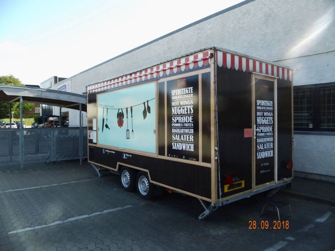 Salgsvogn med salg af spydstegte kyllinger, sandwich og lækker tilbehør