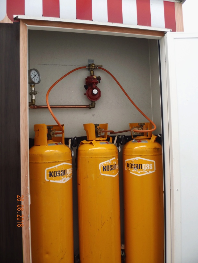 Gasrum med plads til 3 flasker af 33 kg. Der er indbygget sikkerhedsudstyr, så det sikres at der er ventilation i vognen inden gassen kan tændes