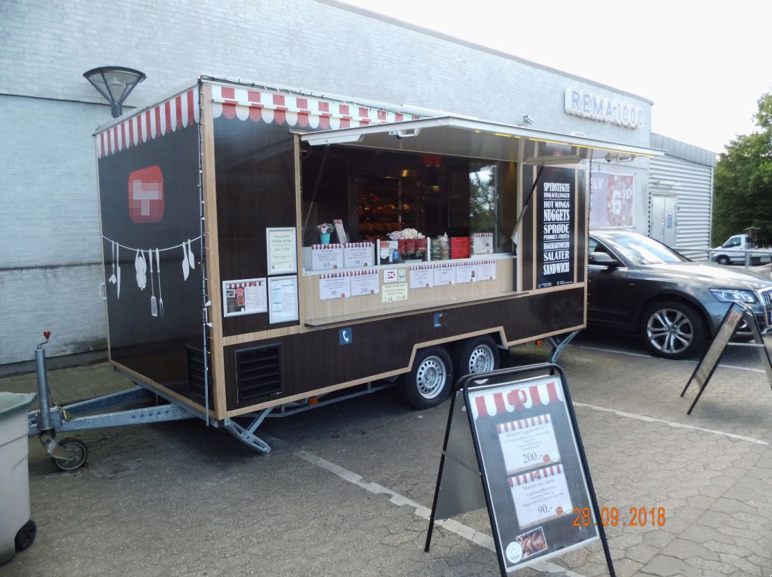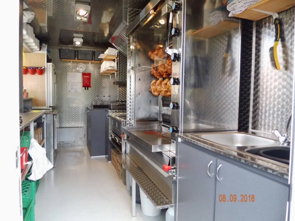 Salgsvognen er indrettet med stor gasgrill, friture med 3 kar, pommes frits varmer, salatkøleskab, sandwichbord med køl, mikroovn, stort køleskab med plads til spydede kyllinger, fryser og rigtig god bordplads.