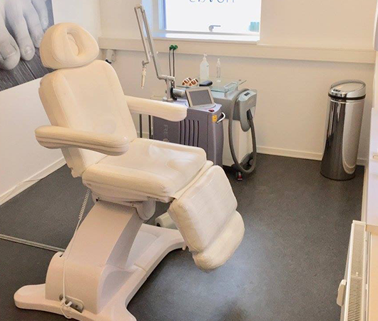 Nyrenoveret klinik på ca. 60 kvm i stilrene linjer. Klinikken deles med en anden virksomhed og vi har hver faste ugedage vi behandler på. Klinikken er fuldt møbleret med venteværelse/reception, samt behandlerrum med laserudstyr, kølemaskine, behandlerstol, håndvask, spejl mm.