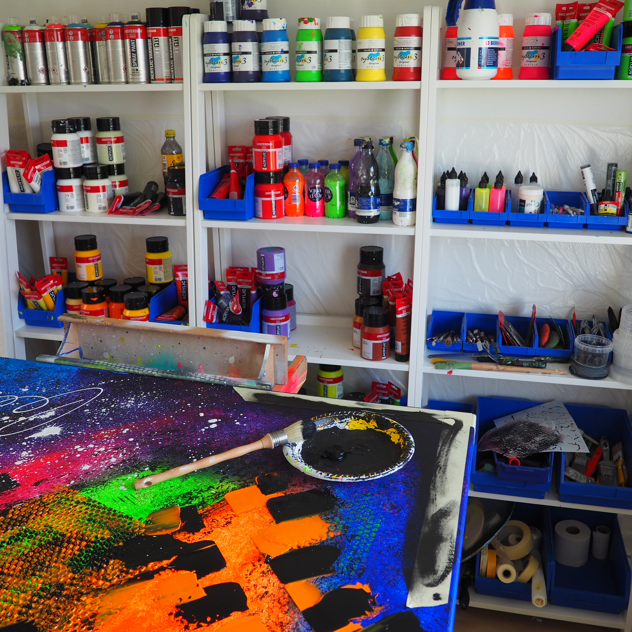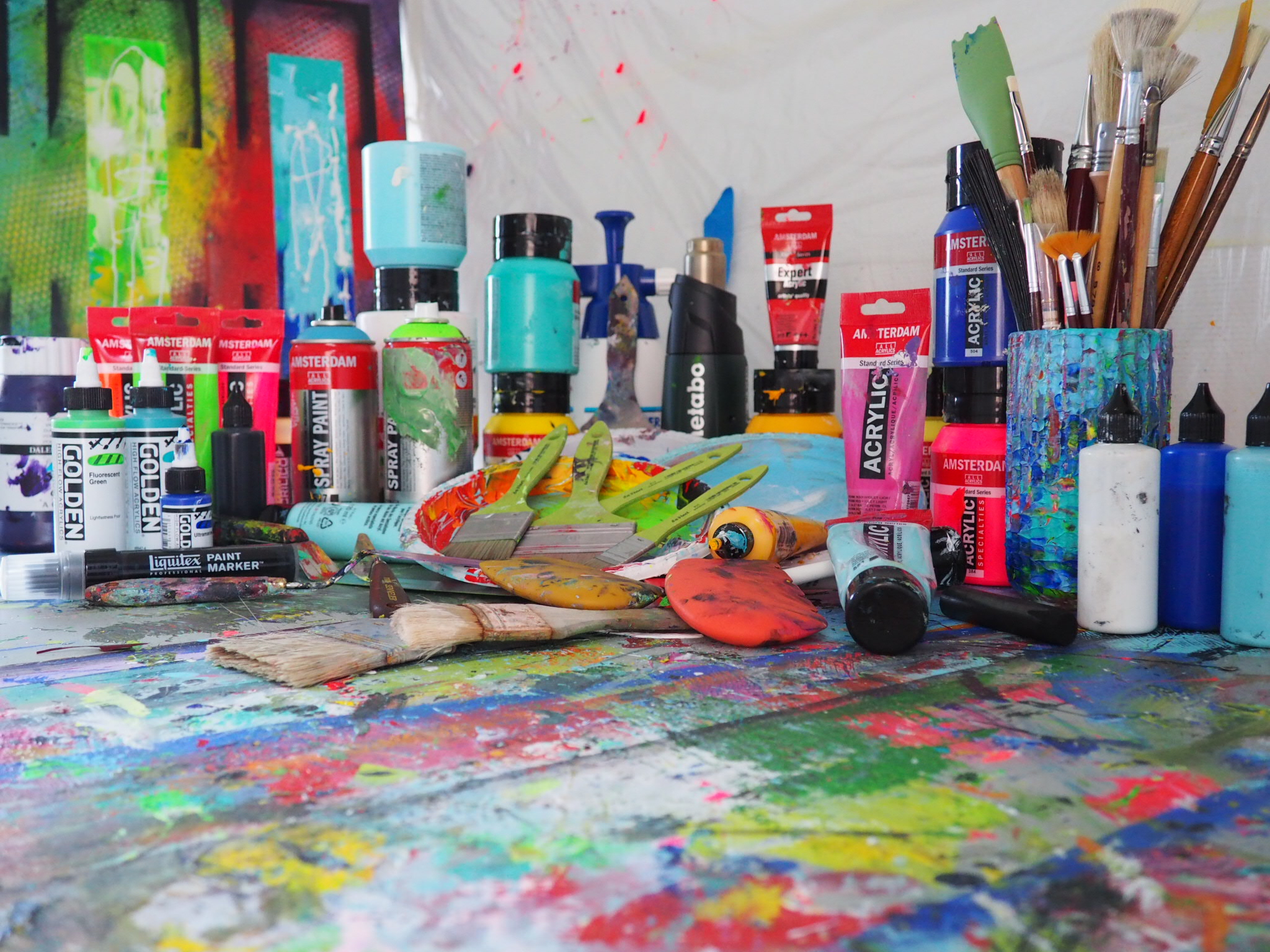 - Amsterdam akryl spraymaling hvor de fleste ud af ca. 60 er ubrugte. Fede farver og neon farver