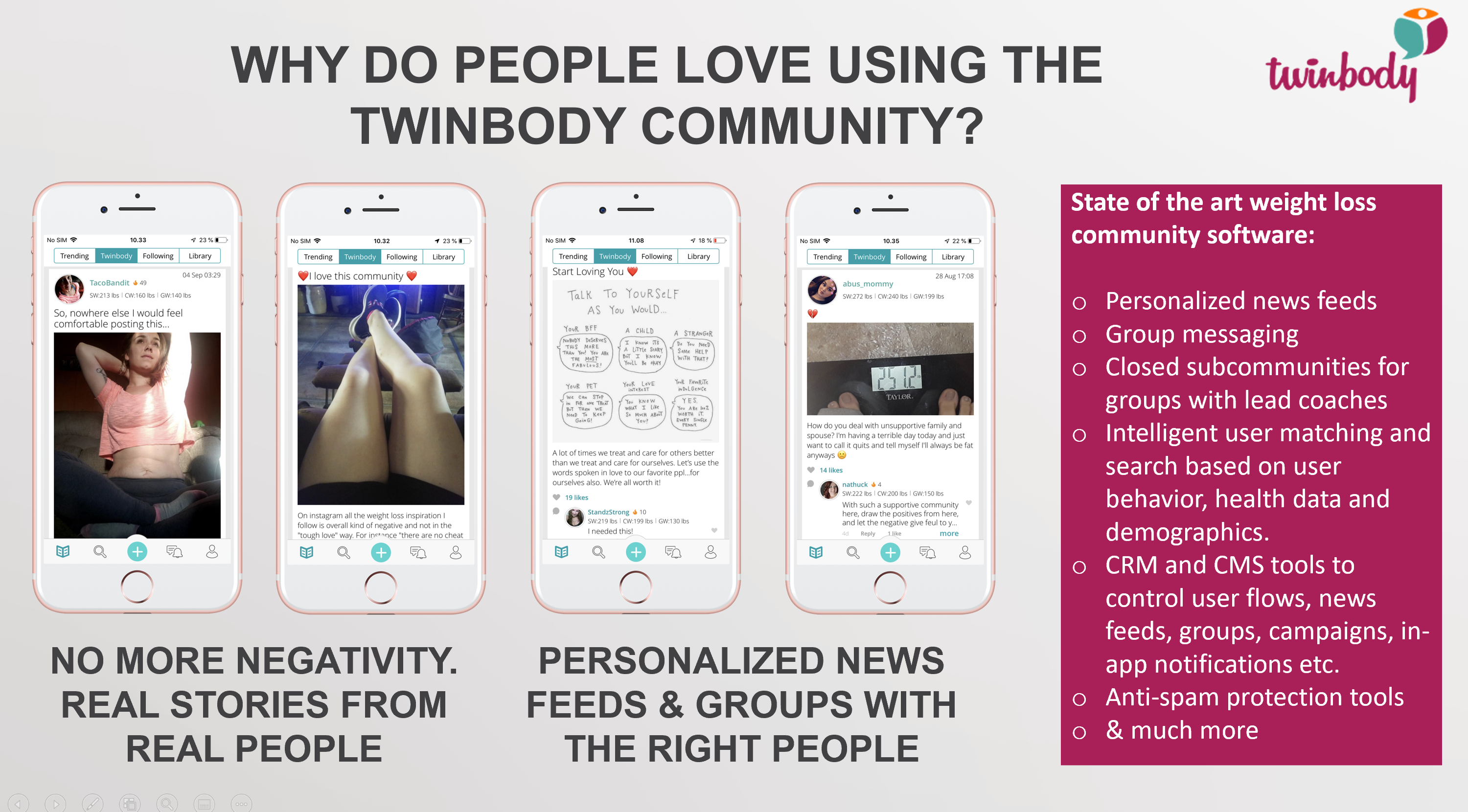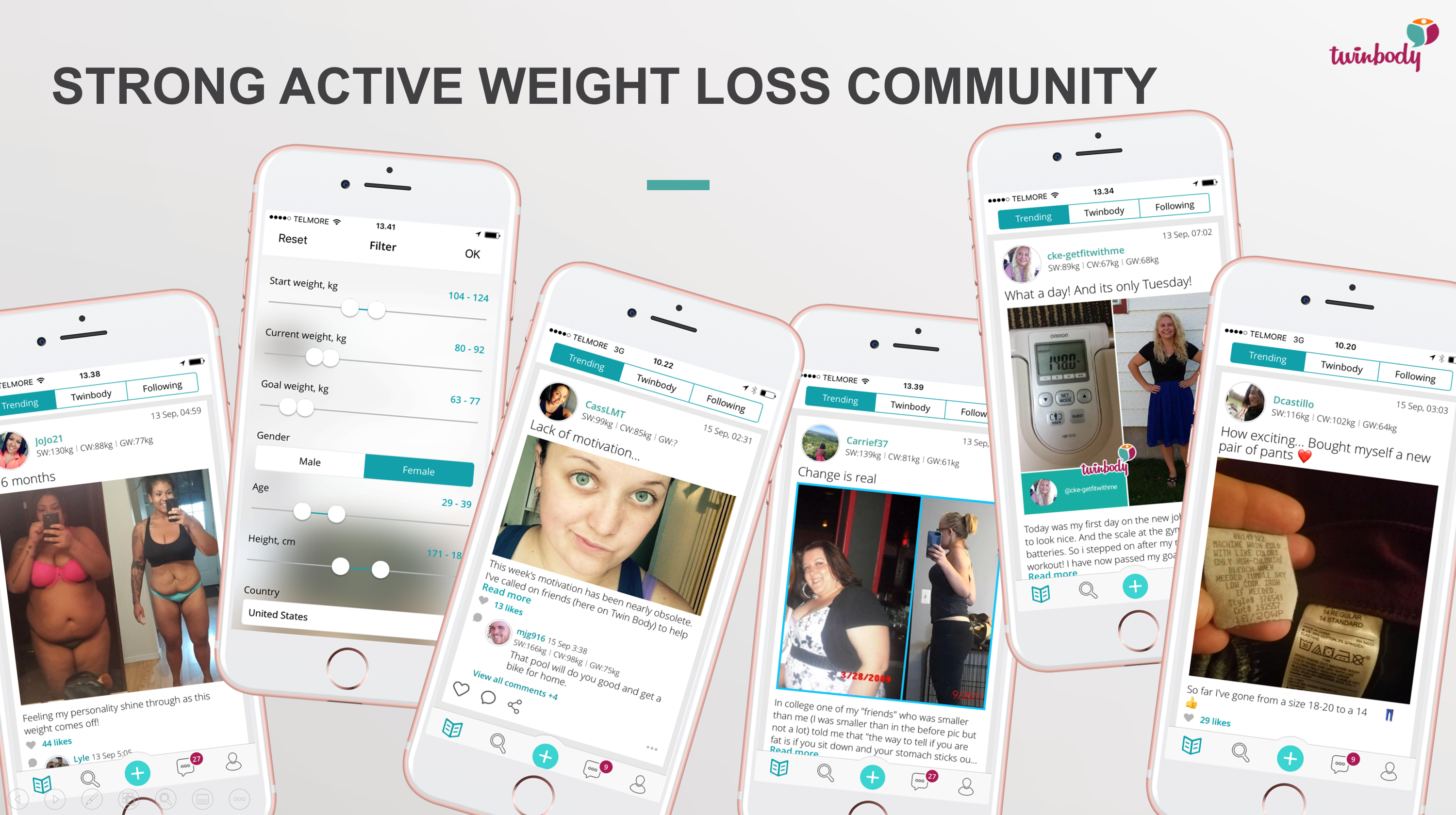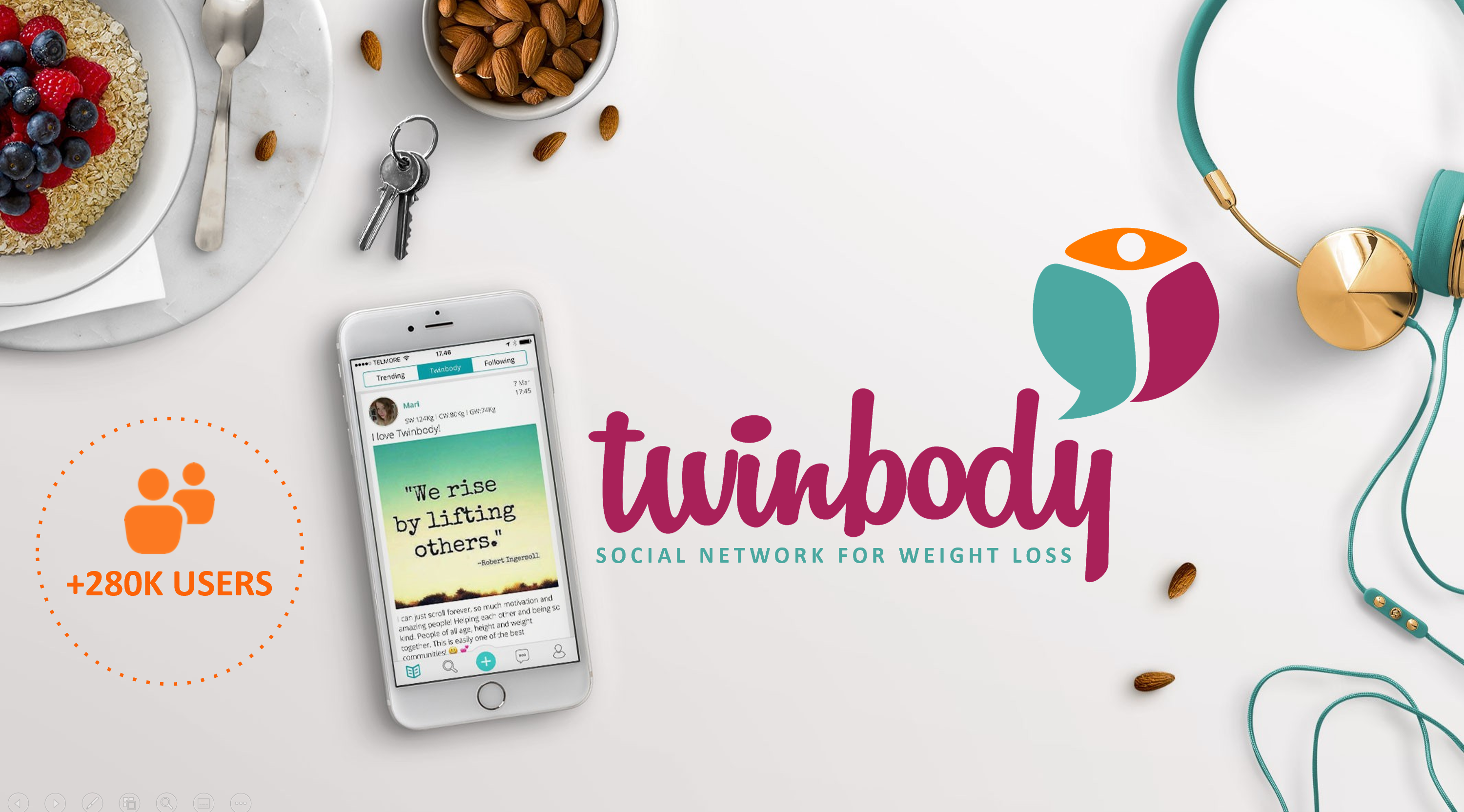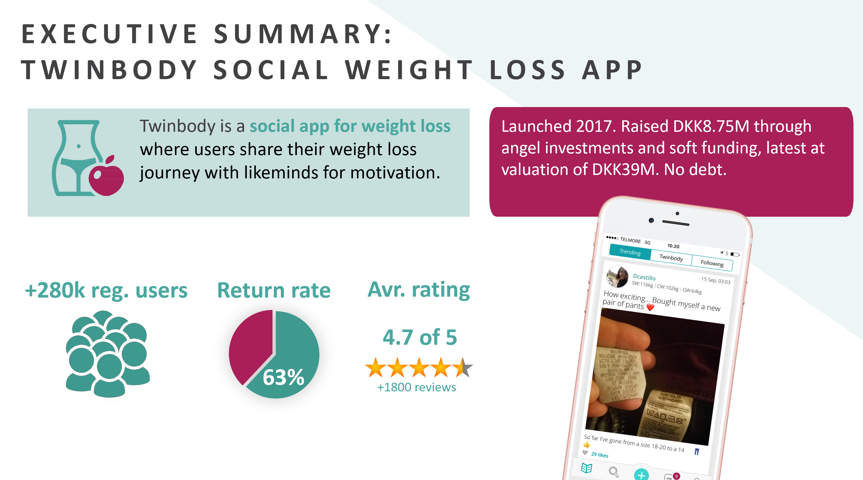 Twinbody er en fitness- og vægttabsapp med 284.000 registrerede brugere der alle søger et sundt vægttab. Brugerne deler og motiverer hinanden til at leve et sundere liv igennem social feeds der ligner det vi kender fra facebook og instagram. Brugerne kan via Twinbody app'en finde folk der har samme kropstype og mål som dem selv og de kan ligeledes tilkøbe vægttabsprogrammer i app'en som leveres via video indhold.