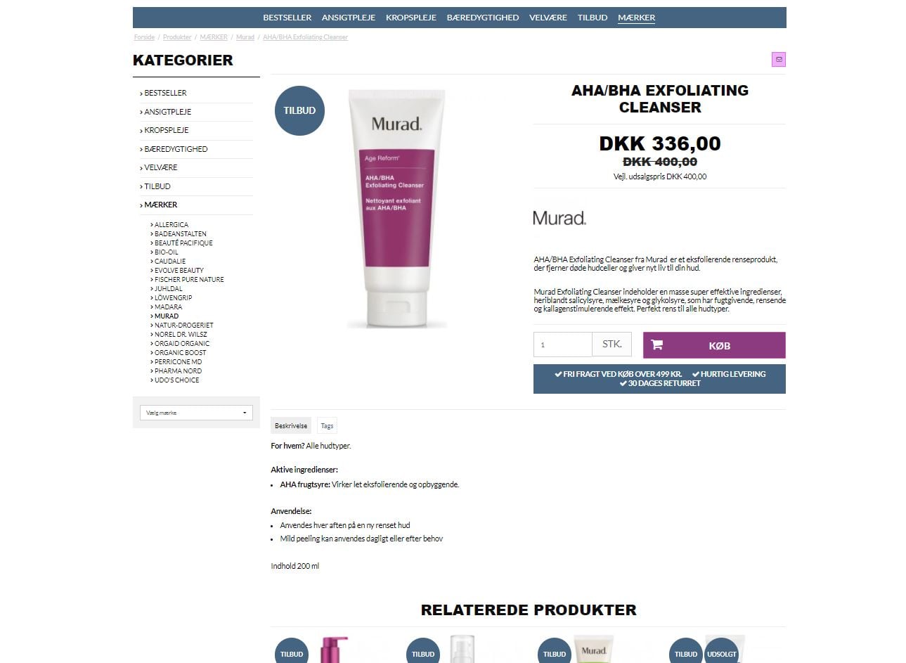Webshoppen sælger bl.a. home care produkter, 443 stk. Vi har mest markedsført os på udvalgte produkter (agentur), da vores fortjeneste er mest baseret på disse produkter.