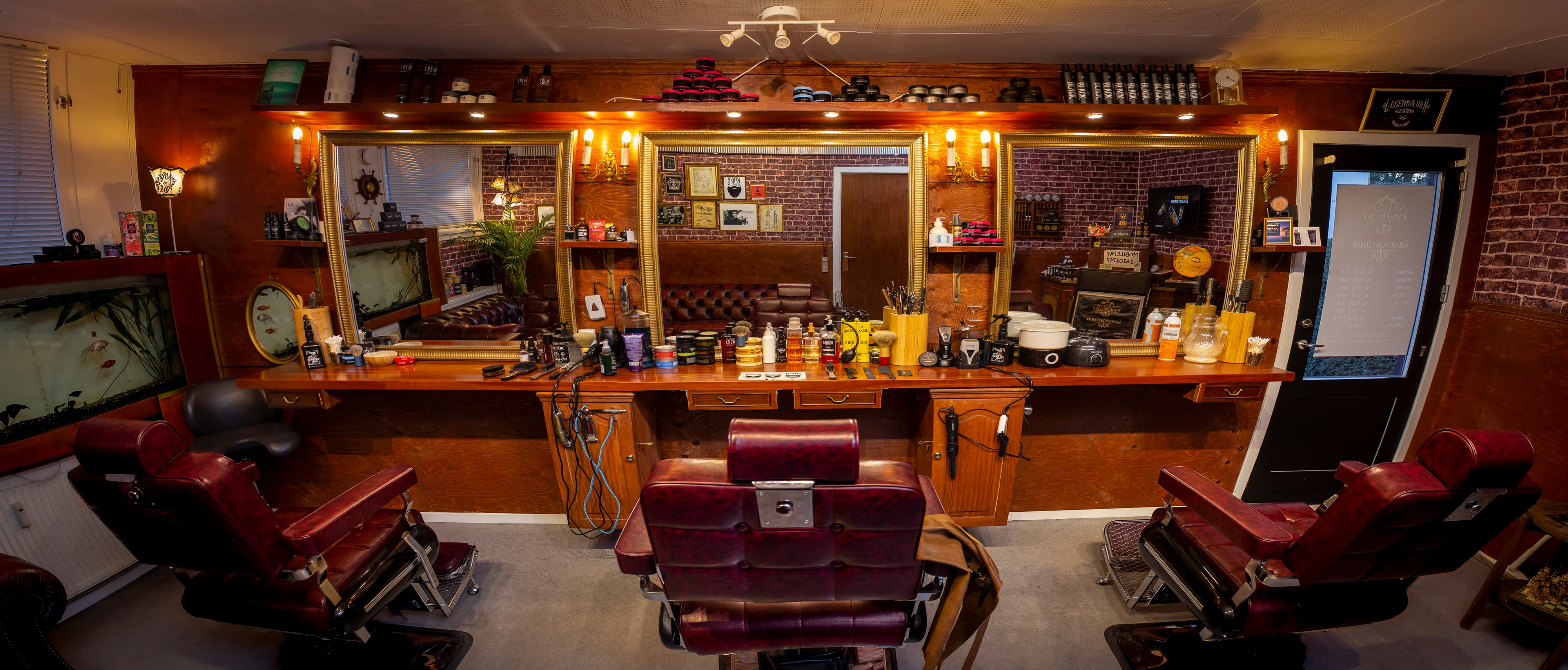 En rigtig 60'er Barbershop for Gentlemen med lav husleje, høj omsætning og stor kundekreds. Den er indrettet i ægte mahogni-stil med Chesterfield sofaer, akvarium og lækre læderstole og der er sørget for alt ned til mindste detalje.