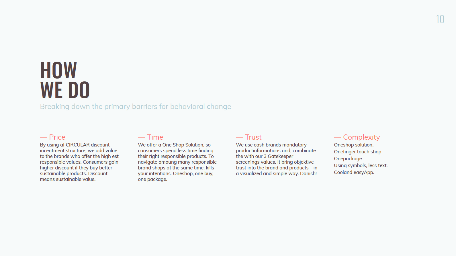Ved at fokusere på at nedbryde 4 primære barrierer for at handle miljøvenligt: tillid, tid, kompleksitet og pris, ønsker vi at skabe adfærdsændringer i danskernes gængse indkøbsvaner, så flere køber bedre og mere ansvarlige produkter til gavn for miljøet og dig.