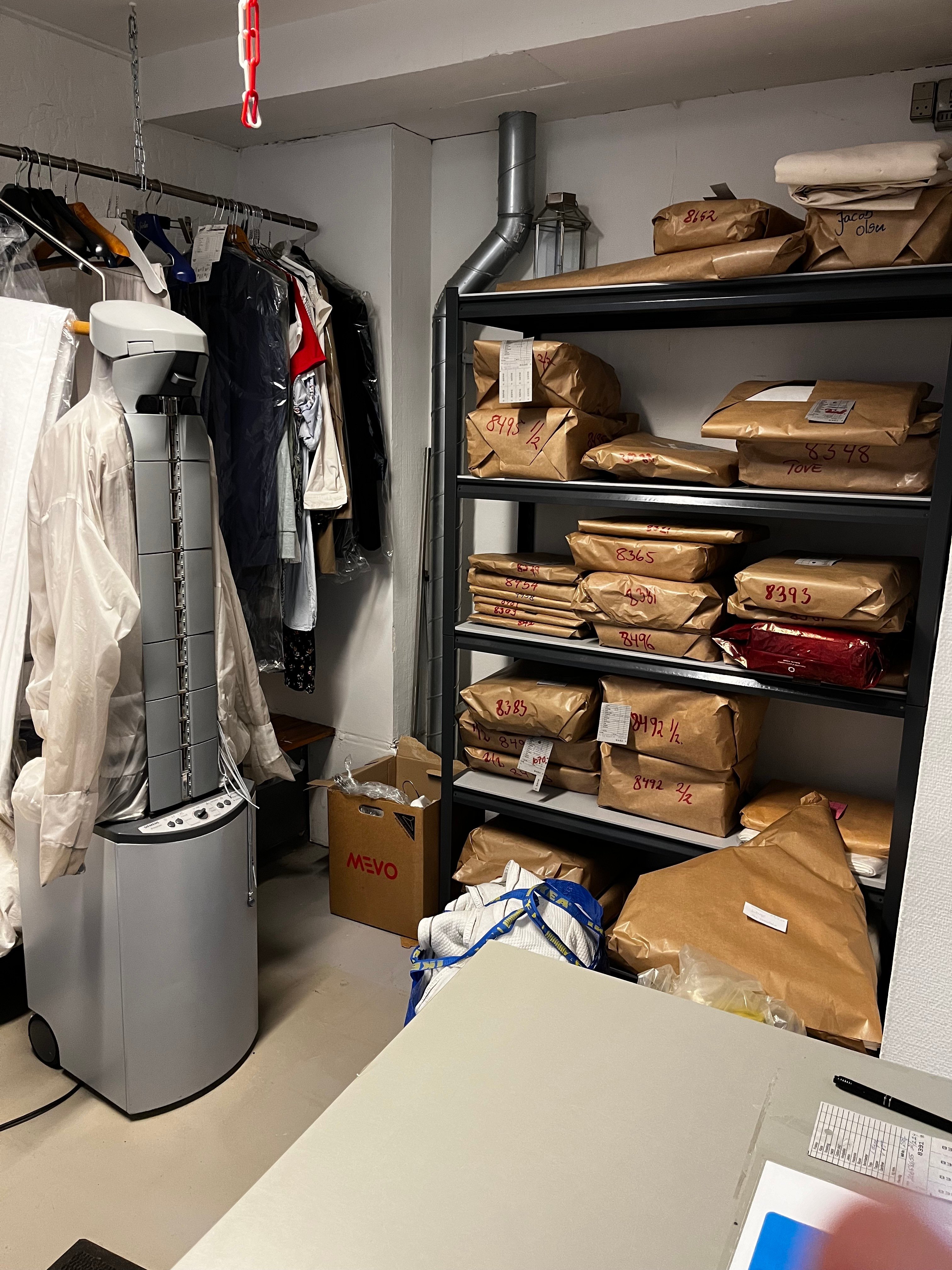Et rum på ca 10 m2 , her opbevares færdigbehandlet tøj til udlevering, området kan lukkes af med en elektrisk metal port når vaskeriet ikke er bemandet.