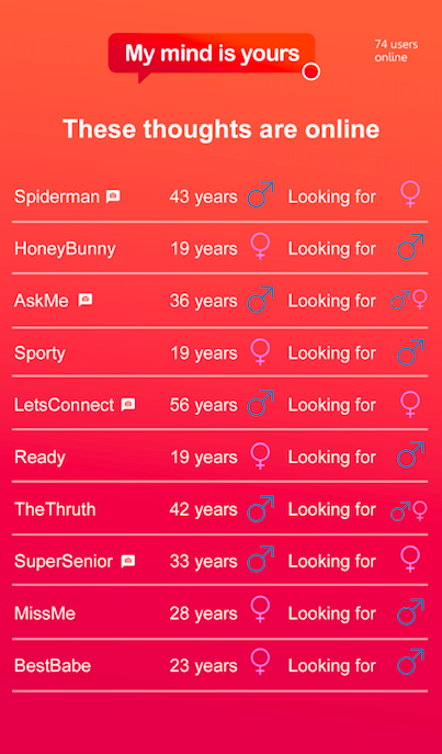 På My Mind Is Yours opretter man en anonym bruger og når man er oprettet kan man skrive og sende billeder til andre brugere helt anonymt. Vi oplever en markant stigende interesse i og for appen i og med man er anonym. Brugerne synes det bliver meget mere "spændende" når man ikke ved hvem man skriver med på den anden side af skærmen.