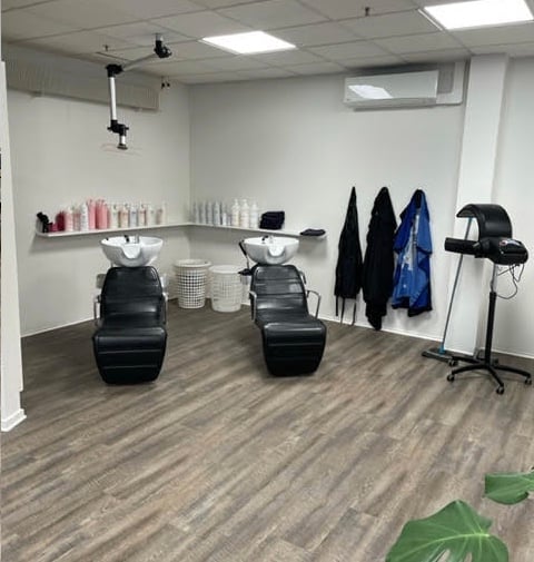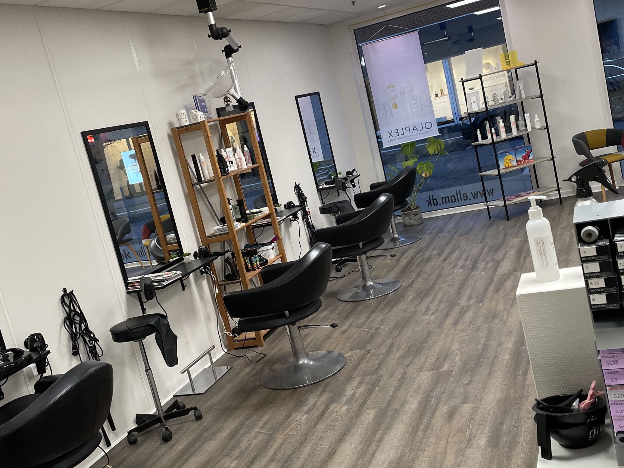 4 kunde pladser - 2 vaske med massage - disk med kasse samt Dankort terminal. Farveafdeling med hylder.