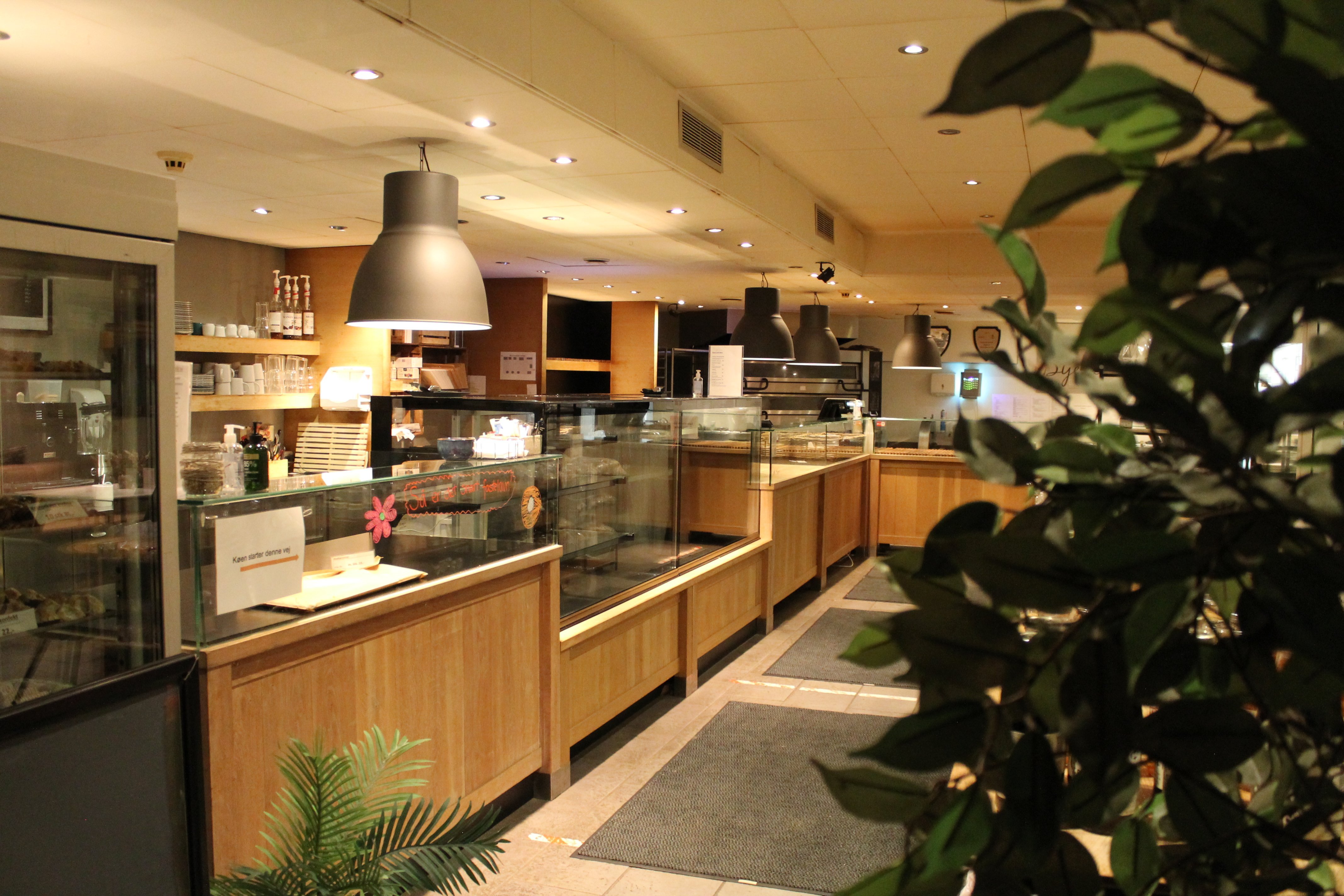 Stor og vinkel salgsdisk i et plan, bagvæg med med brødhylder, koldjomfru, 3 kølemontre, rugbrødskærer, kølerum butik, Stort fryseskab butik, opvaskemaskine butik/cafe, køl til sandwich, 1 frysetårne, 2 nyere kasseapparater, tallerkener, kopper og bestik til caféen, cafeborde og nye stole i caféen.