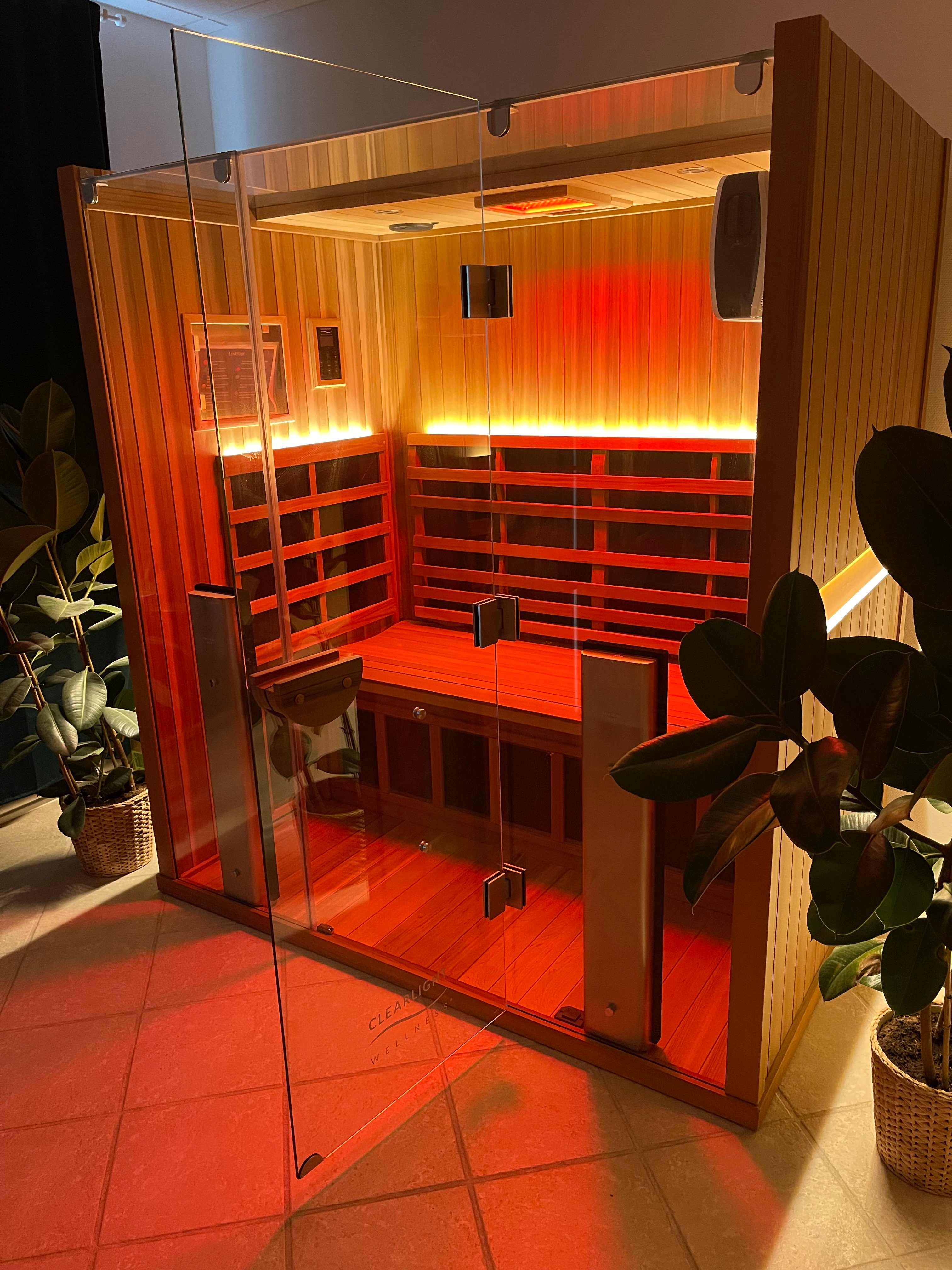Infrarød saltsauna fra Clearlight Sauna (https://infraredsauna.com/sanctuary-three-person/) (nypris: 12.000€)