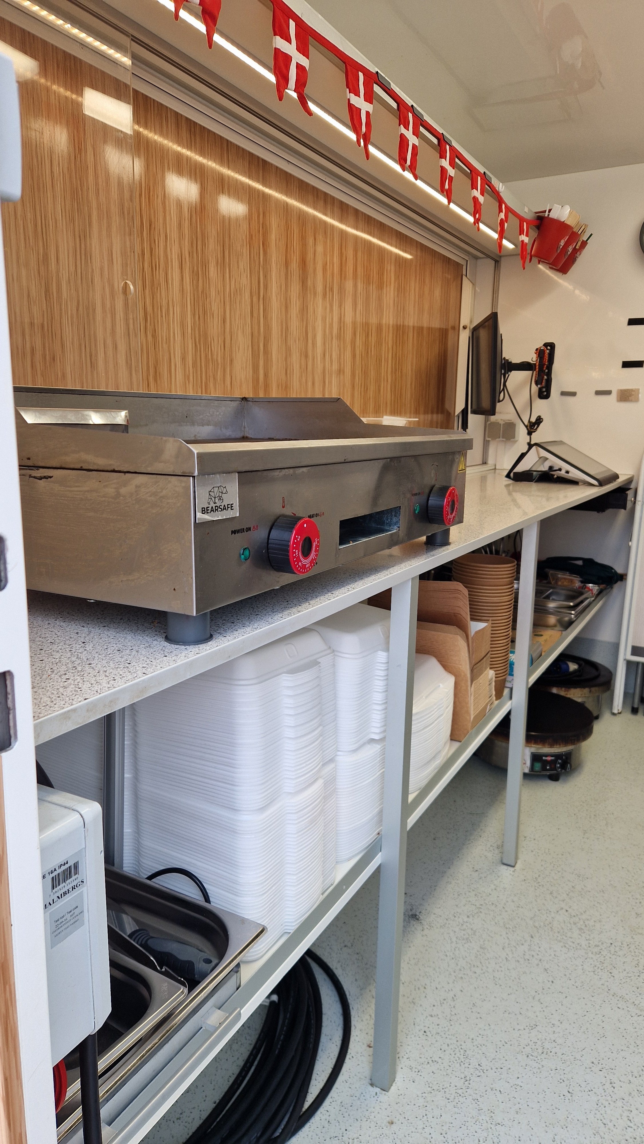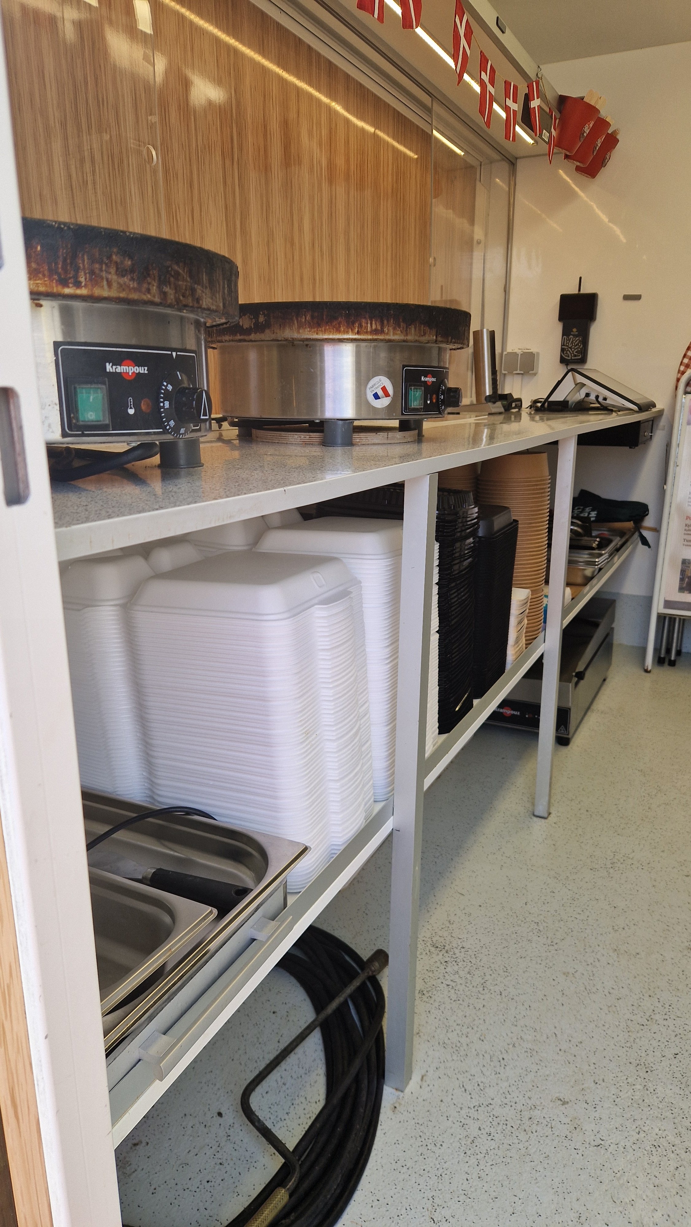 Der medfølger 4 pandekagesteger, 2 burgergrill, 2 Hotpot, 2 vandkogere, 2 køleskabe, 2 frysere, 2 kasseterminaler med dankort, 2 varmeplader, 2 kogeblus, 4 cafeborde, 2 A-bukke, 2X20 meter kabel, diverse redskaber og opbevaringsbokse, 2 pulverslukker og 2 brandtæpper