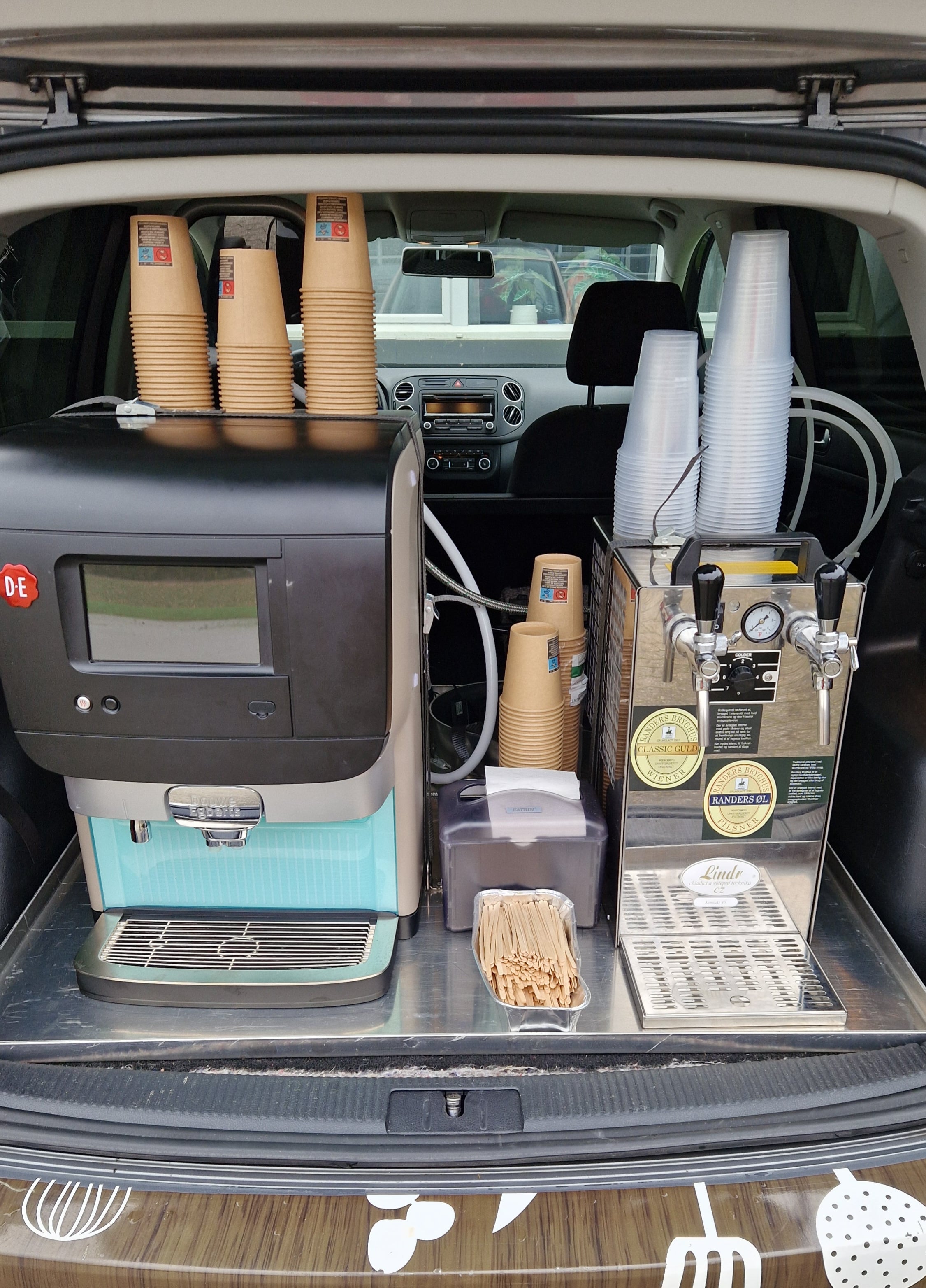2 topmoderne salgsvogne med masser af udstyr og en Golf-van udstyret med øl- og kaffemaskine
