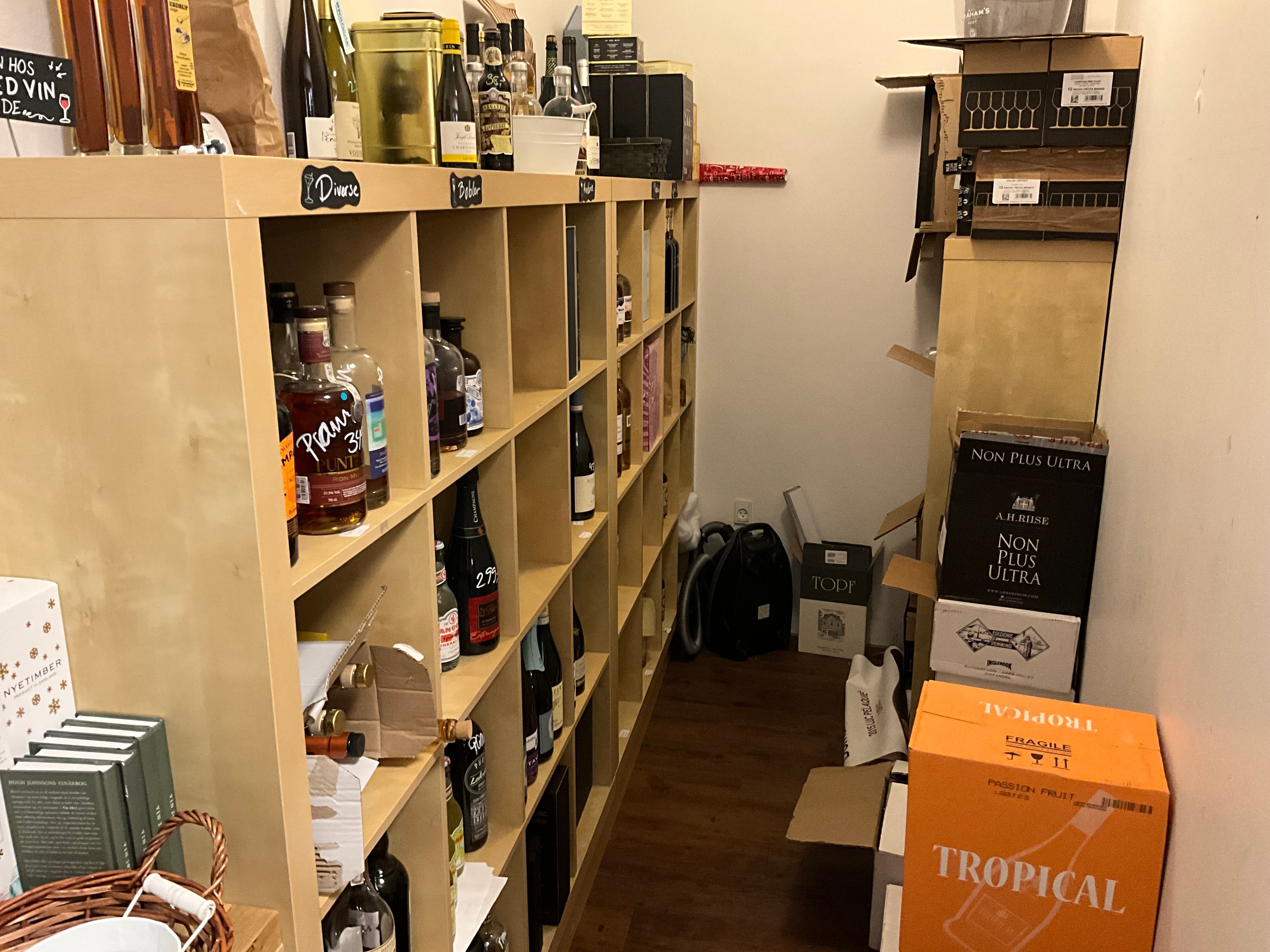Butikslokalet er ca 70 kvm med store vinduer til Hovedgaden og sort inventar til flasker. Der er 2 computere, der begge kan bruges til kundeekspedition.